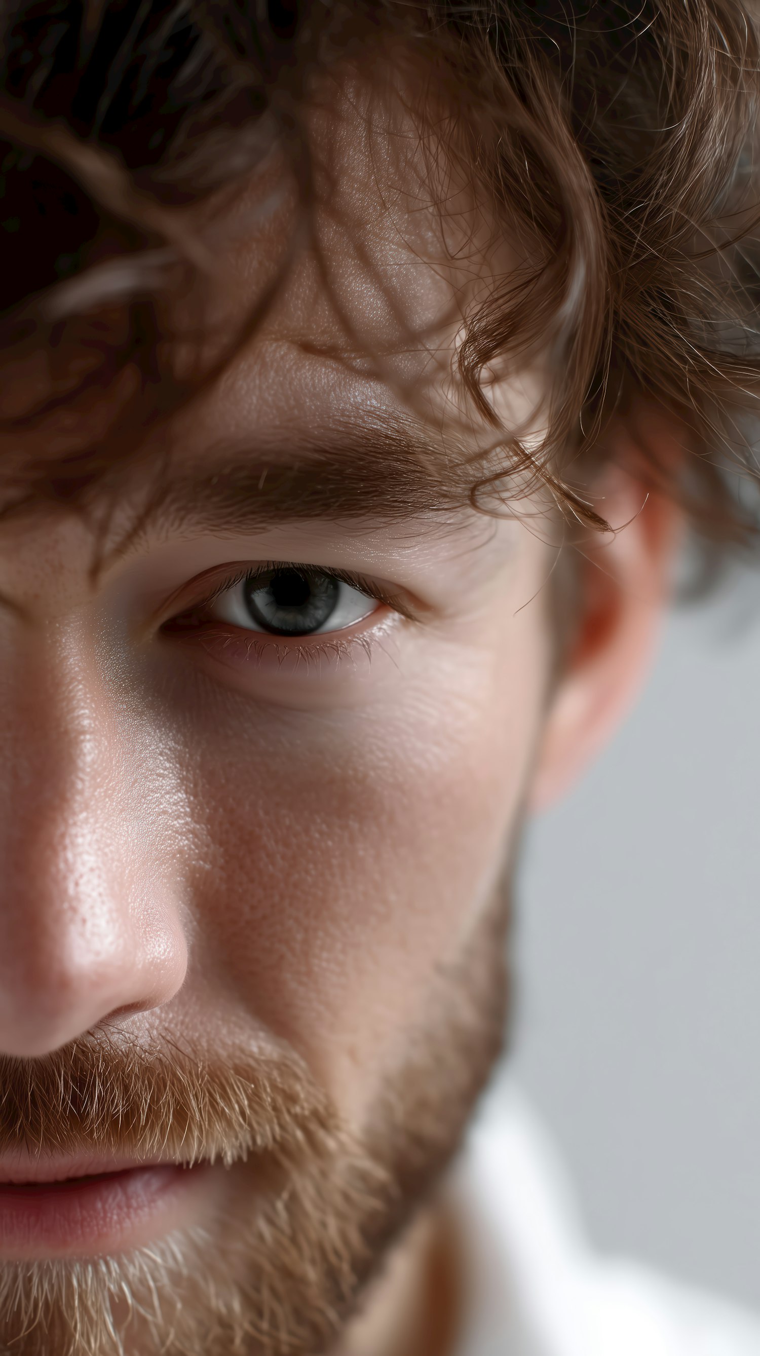 Close-up of a young man with blue eyes, wavy brown hair, and a beard, gazing intensely. Soft lighting highlights his facial features.
