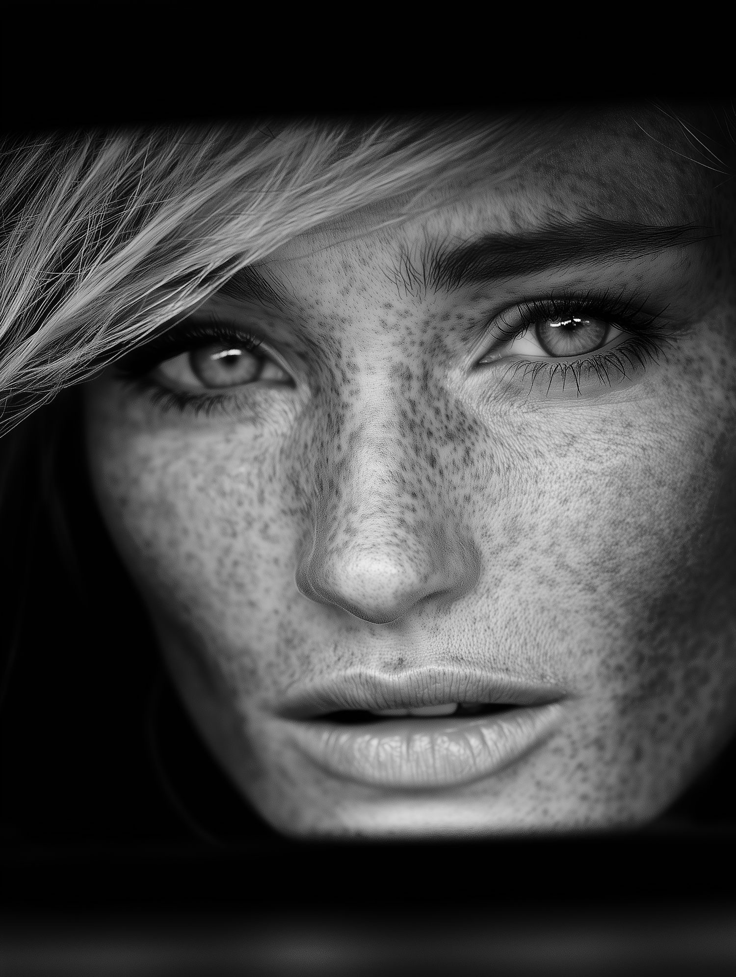 Striking black and white close-up portrait highlighting freckles and expressive eyes, with light hair adding texture.