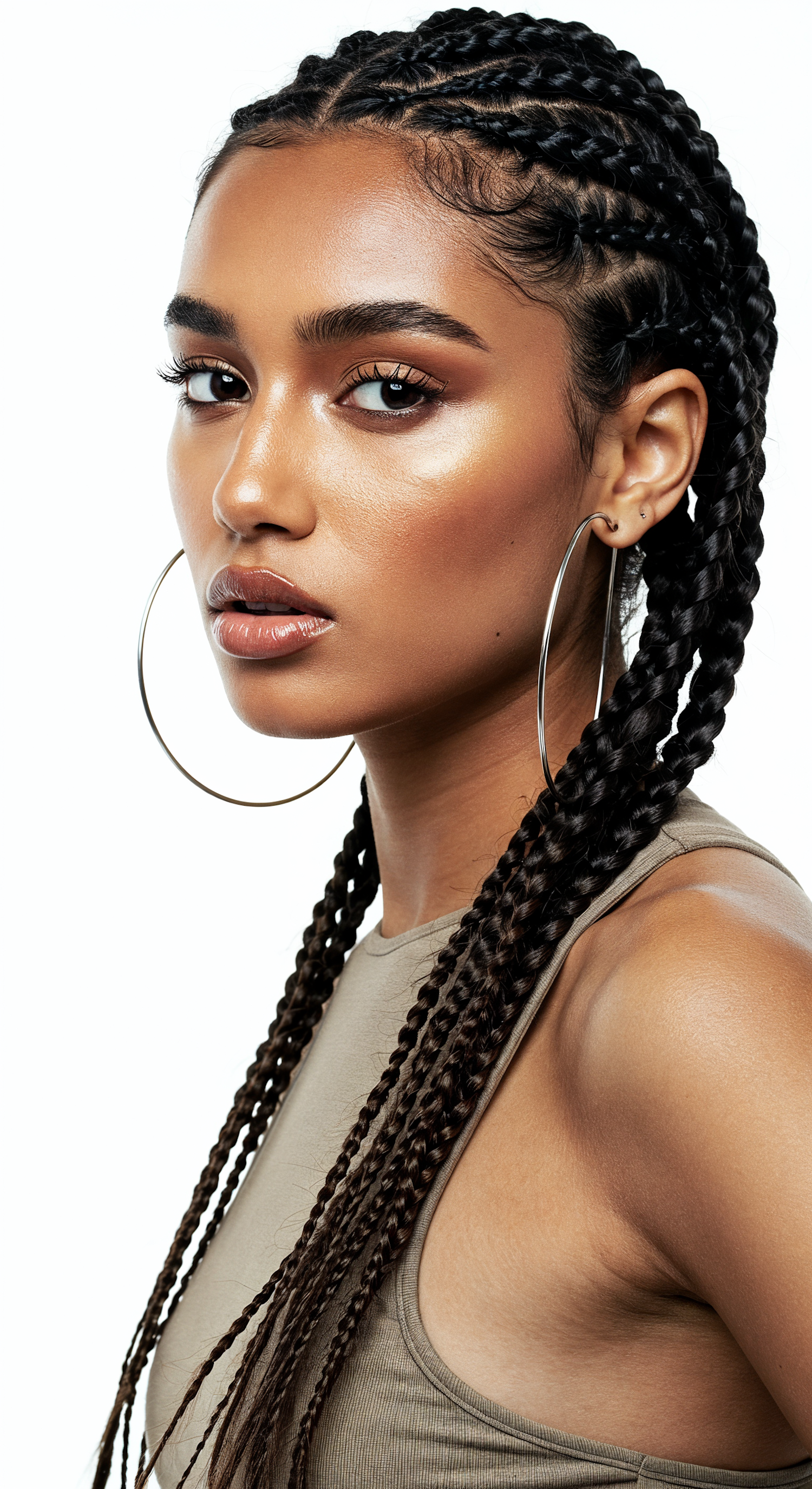 Close-up of a woman with cornrow braids, hoop earrings, and glowing makeup, set against a clean white background.