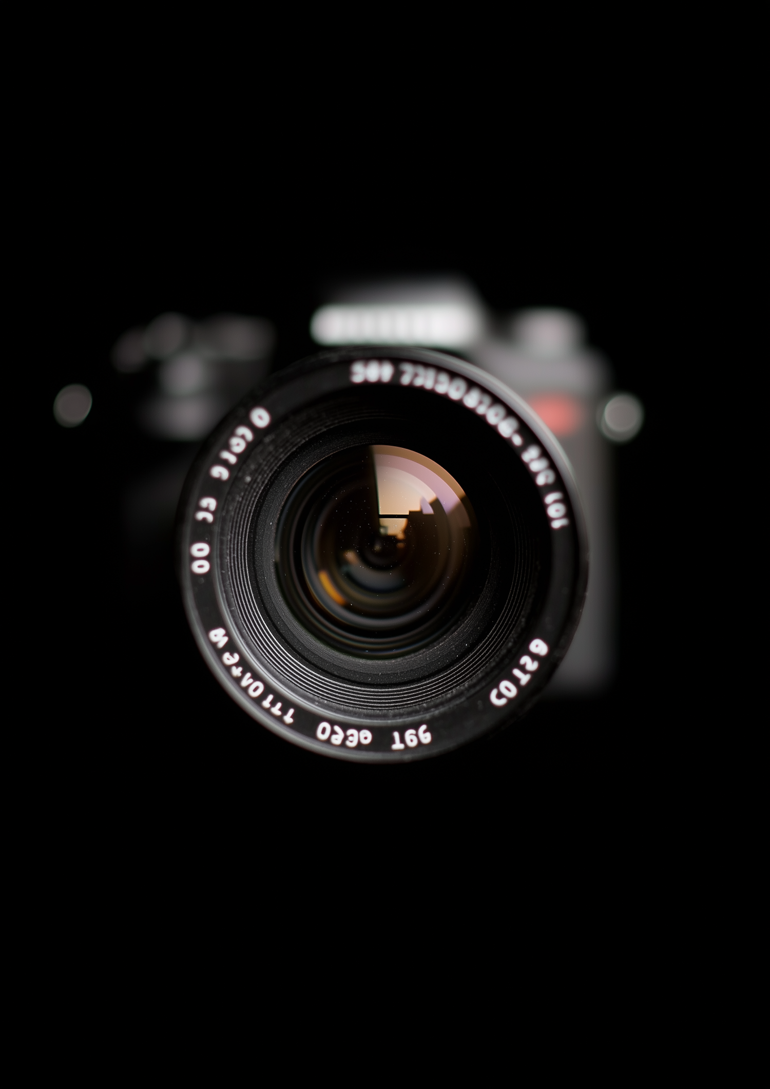 Close-up of a camera lens with sharp details and a dark background, highlighting its reflective surface and technical design.