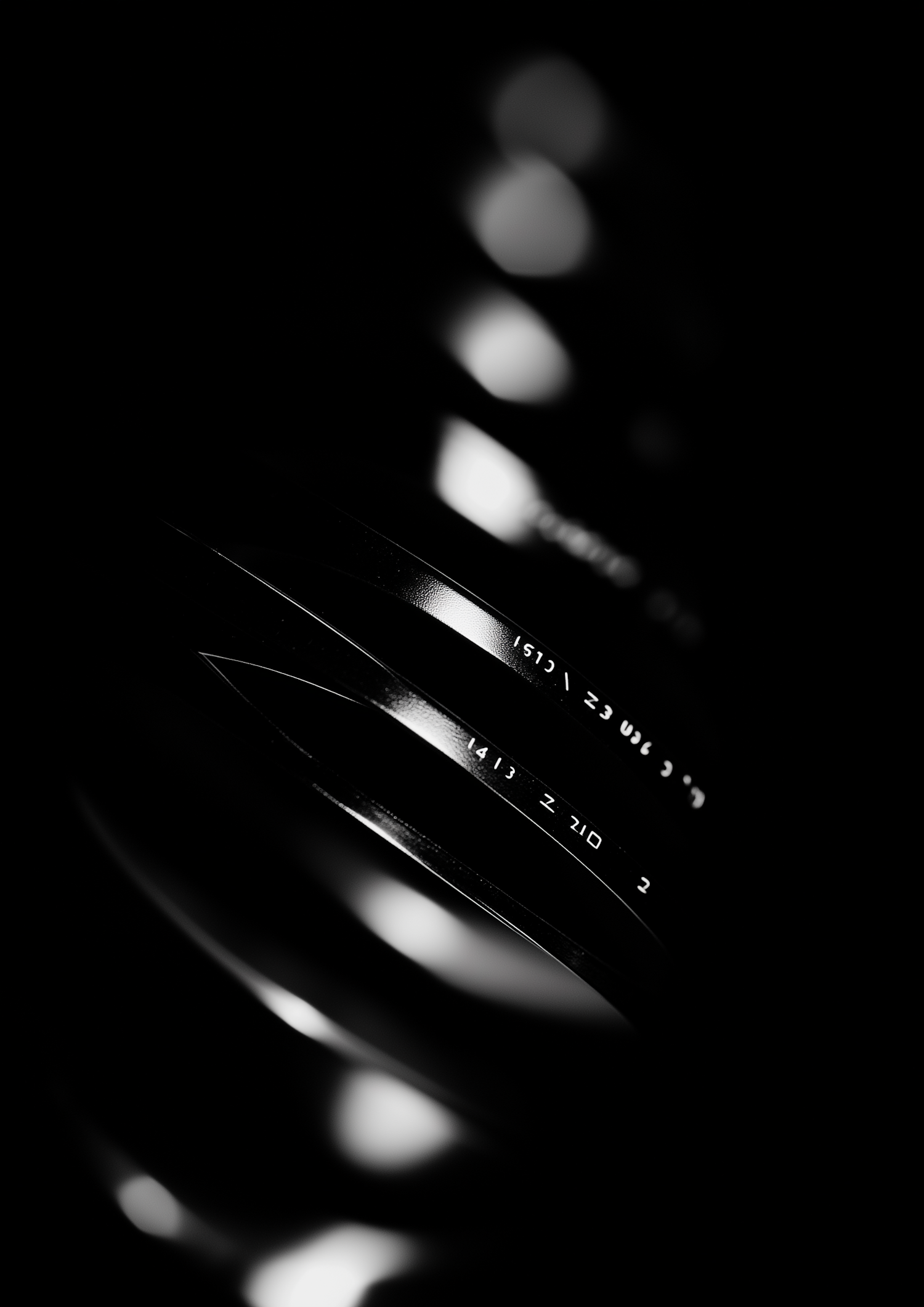 Close-up of a camera lens with dramatic lighting, showcasing its metallic rings and engraved text against a black background.