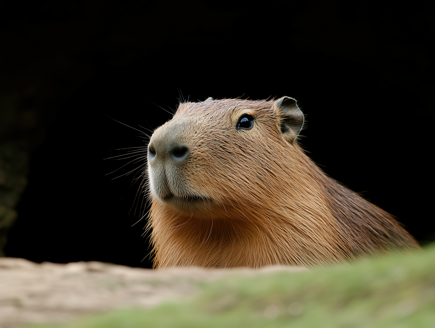 Close-up of a golden-brown capybara with a dark background, showcasing its whiskers, moist nose, and rounded ears.