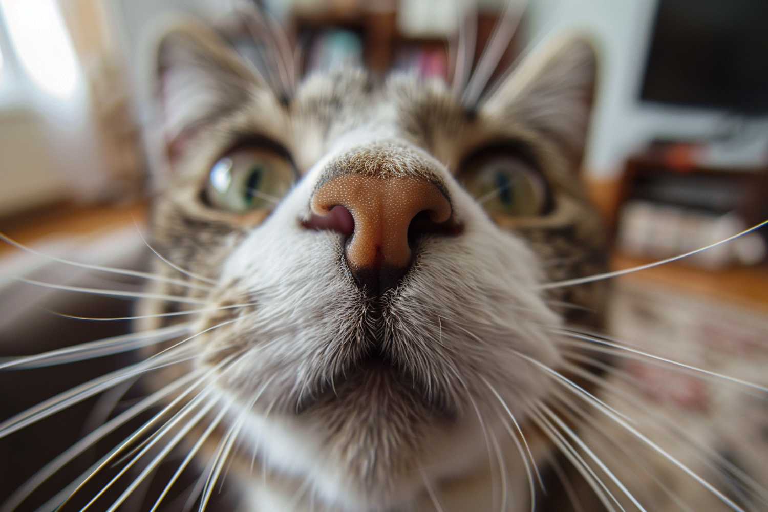 Close-up of a cat's nose and whiskers, with a blurred indoor background. The cat's curious eyes peek from behind its pink nose.