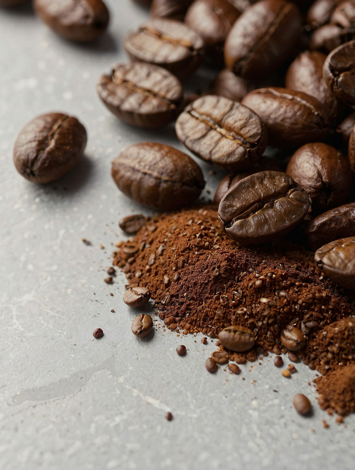 Close-up of roasted coffee beans and ground coffee on a gray surface, showcasing rich textures and earthy tones.
