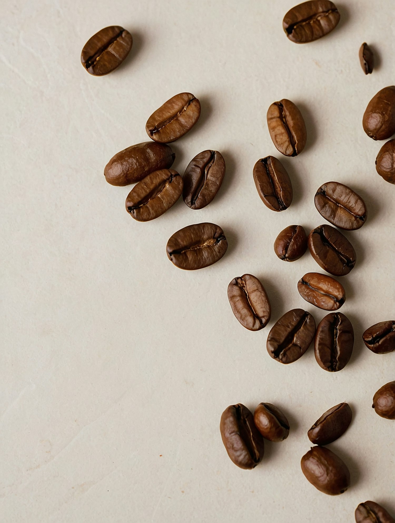 Close-up of roasted coffee beans scattered on a beige surface, showcasing their rich brown tones and textured details.