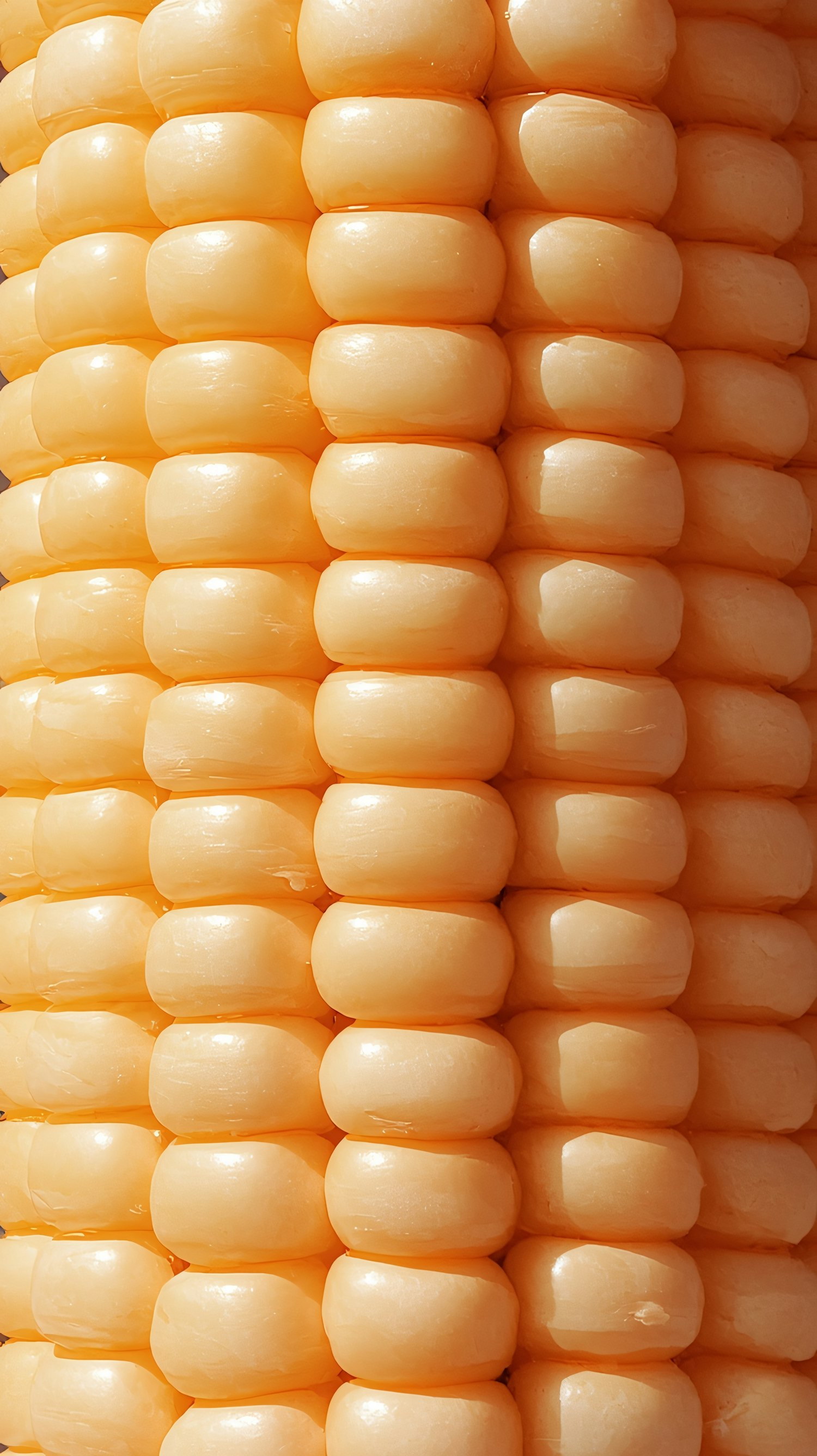 Close-up of a corn cob with glossy, pale yellow kernels arranged in neat rows, highlighting its natural texture and pattern.