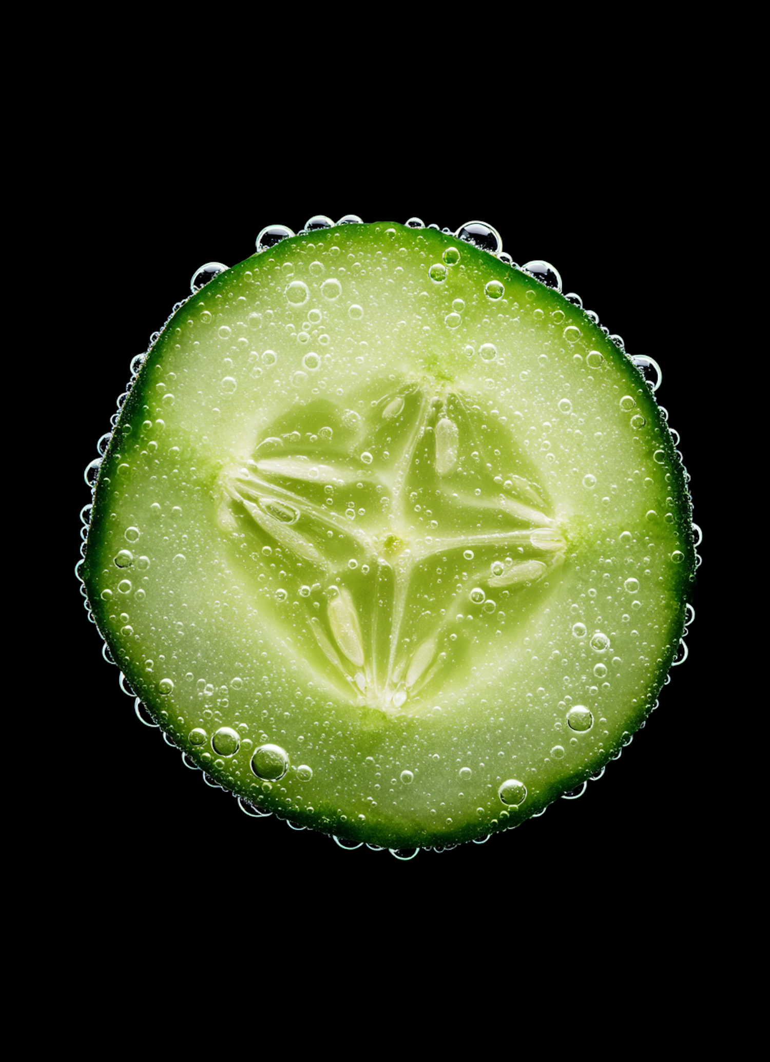 Close-up of a fresh cucumber slice with water droplets on a black background, highlighting its vibrant green color and crisp texture.