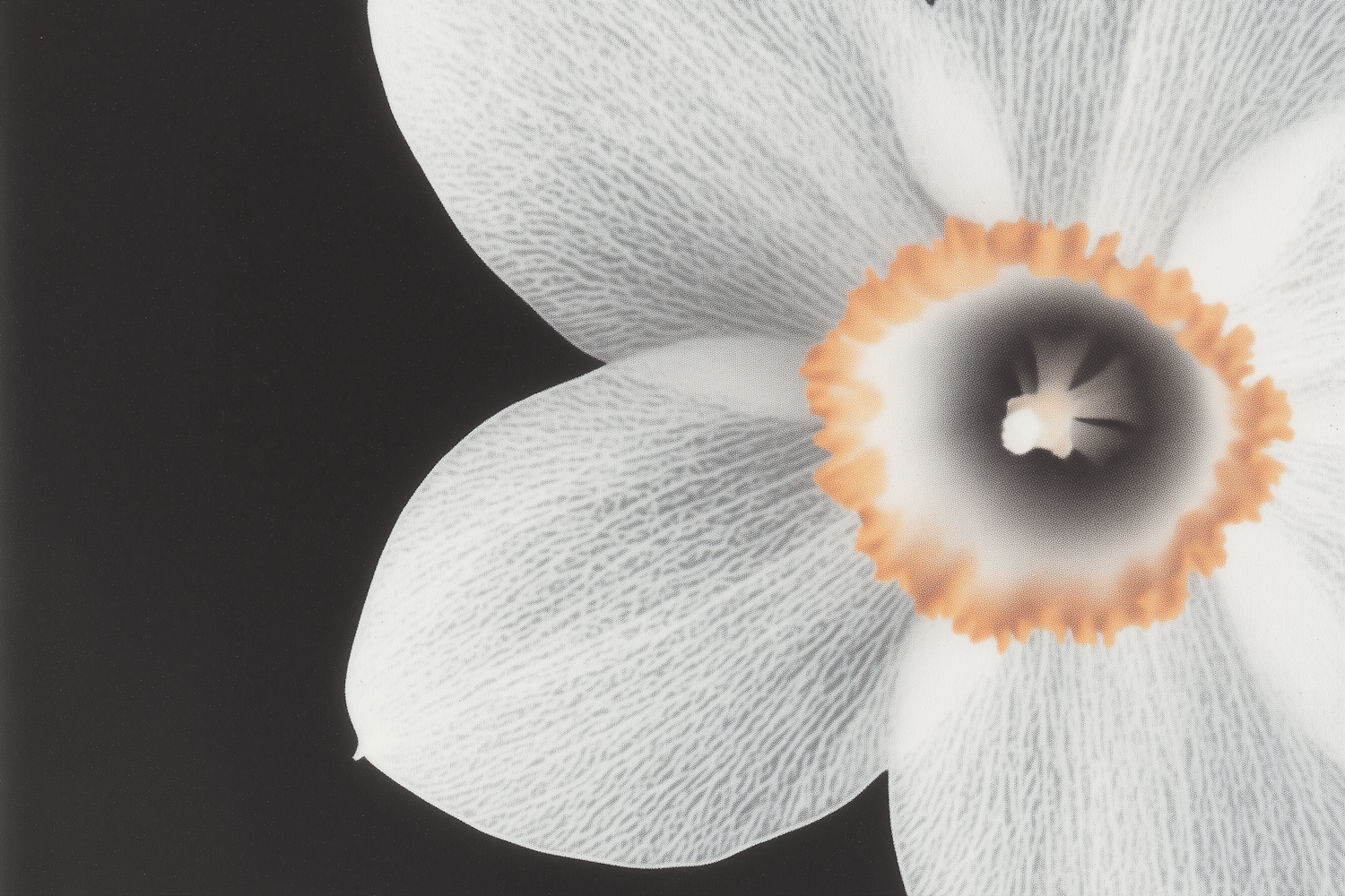 Close-up of a daffodil with white petals and an orange center against a black background, highlighting its intricate textures.
