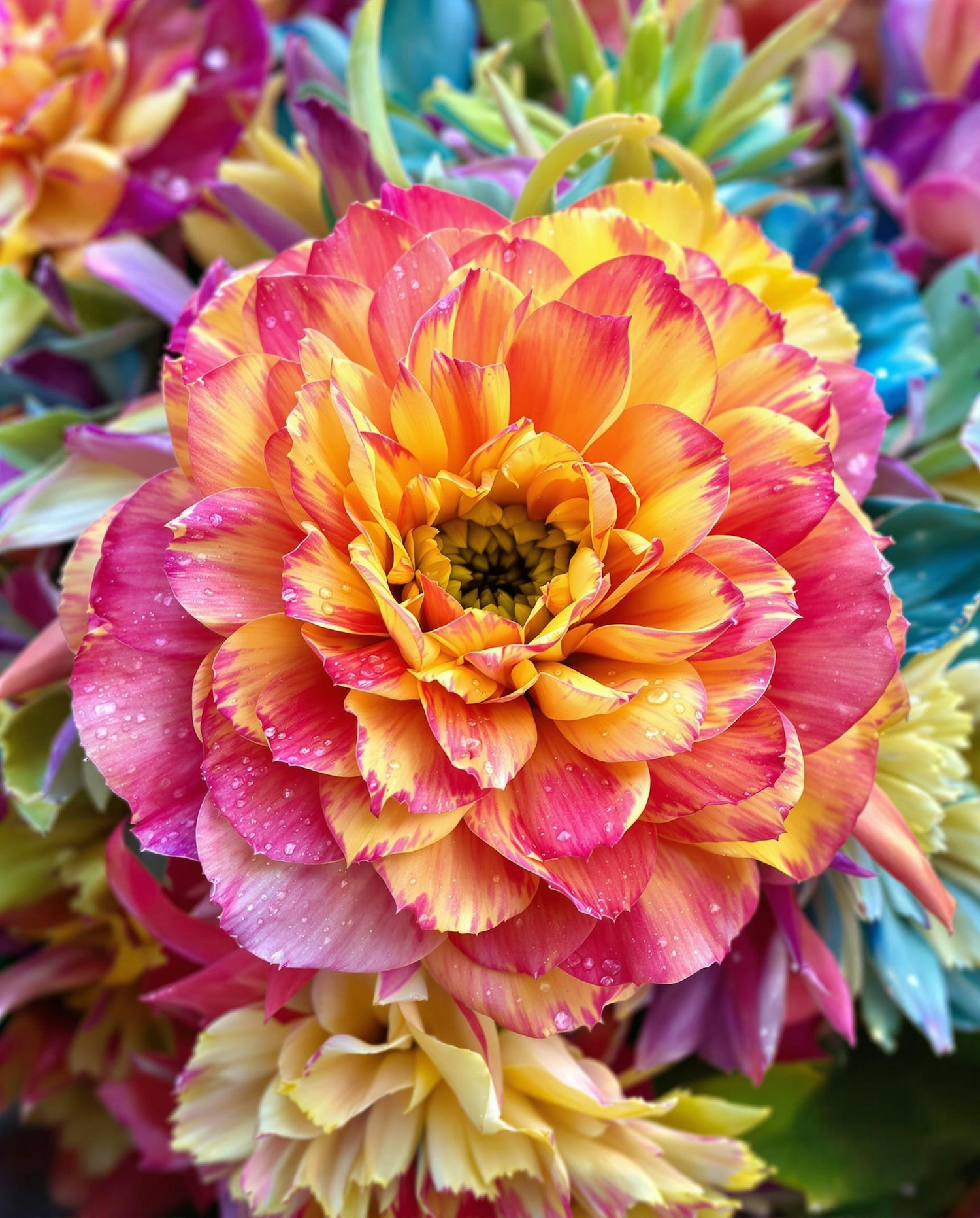 Bright and colorful floral close-up, fresh flowers with water droplets, macro photography, high saturation, dreamy and vibrant, soft natural light, joyful and lively aesthetic — Multicolored ranunculus flowers intertwined, richly textured.