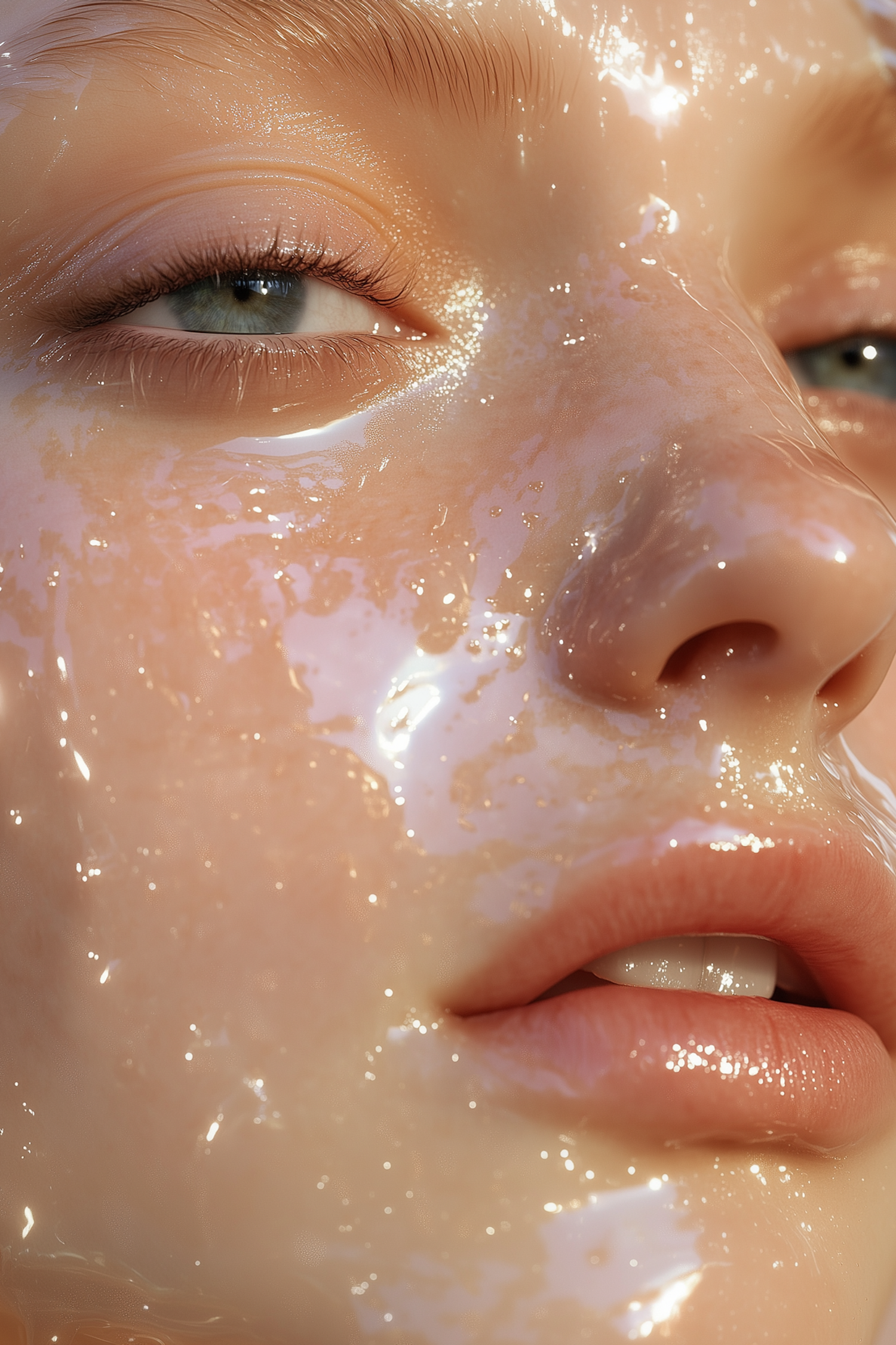Close-up of a dewy, glowing face with green eyes, glossy skin, and natural pink lips, showcasing skincare or beauty aesthetics.