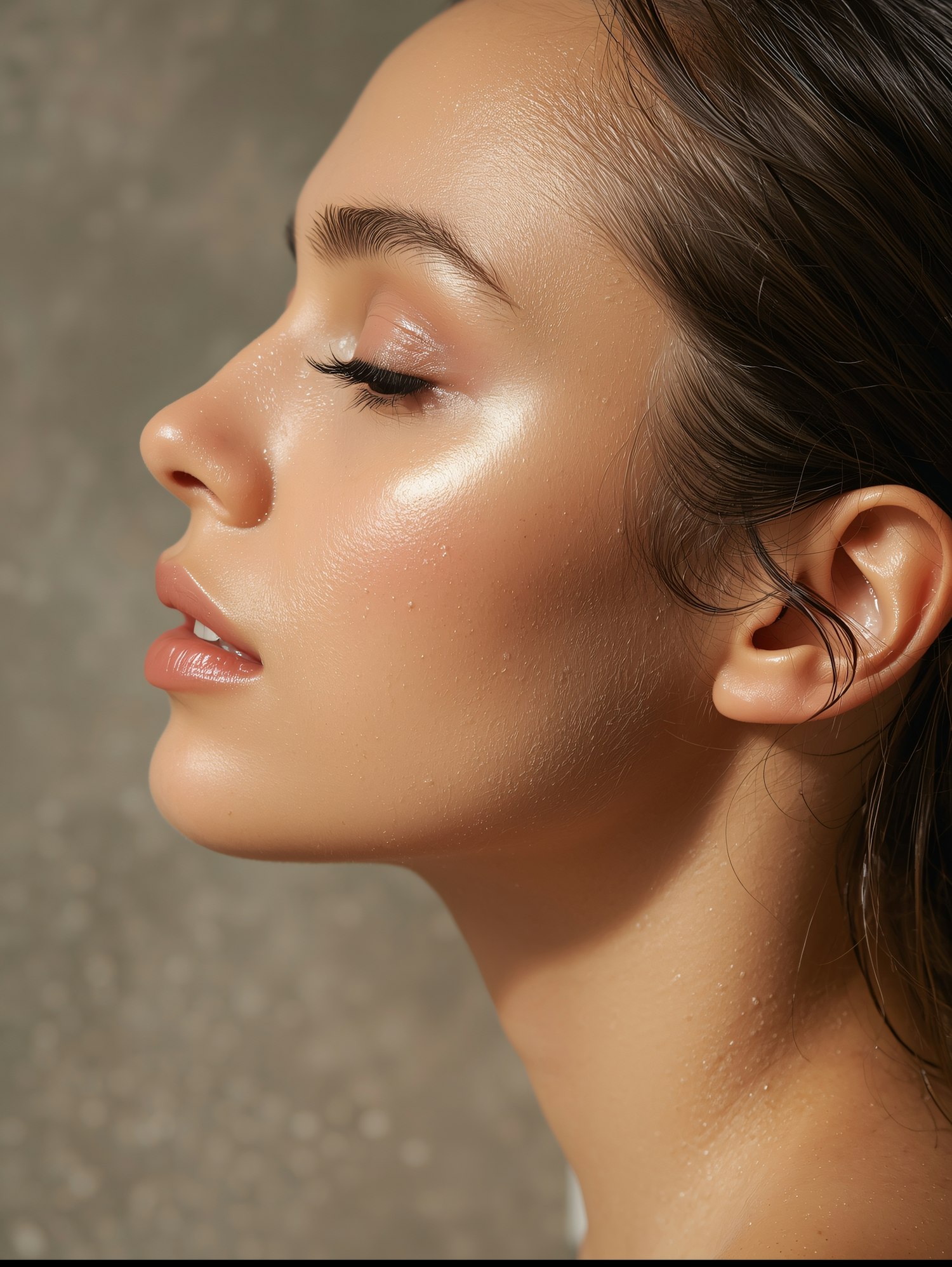 Close-up side profile of a person with glowing skin and wet hair, showcasing a dewy complexion and natural beauty.