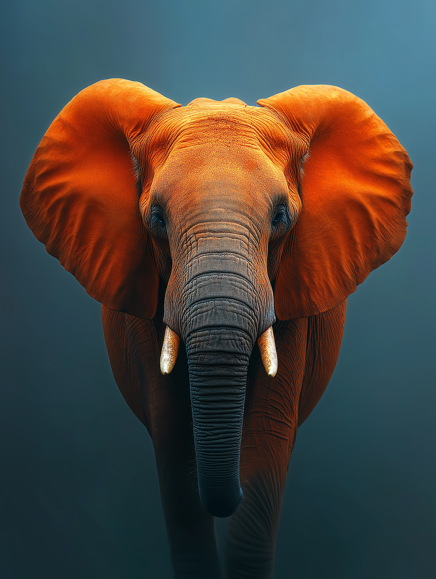Close-up of an elephant with vivid orange ears and a textured gray trunk against a teal gradient background. Stunning and surreal details.