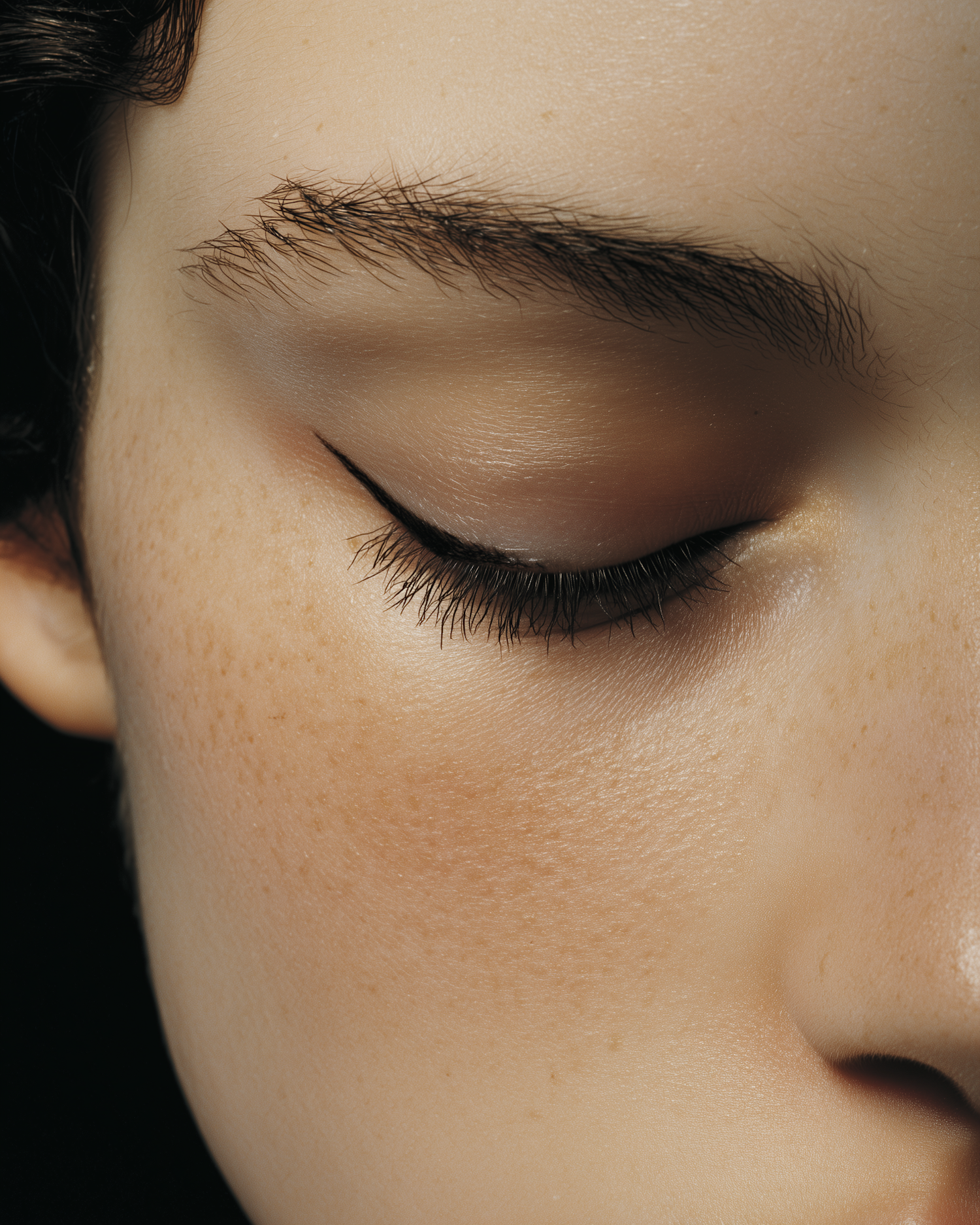 Close-up of a closed eye with natural makeup, showcasing smooth skin, freckles, and neatly applied eyeliner.