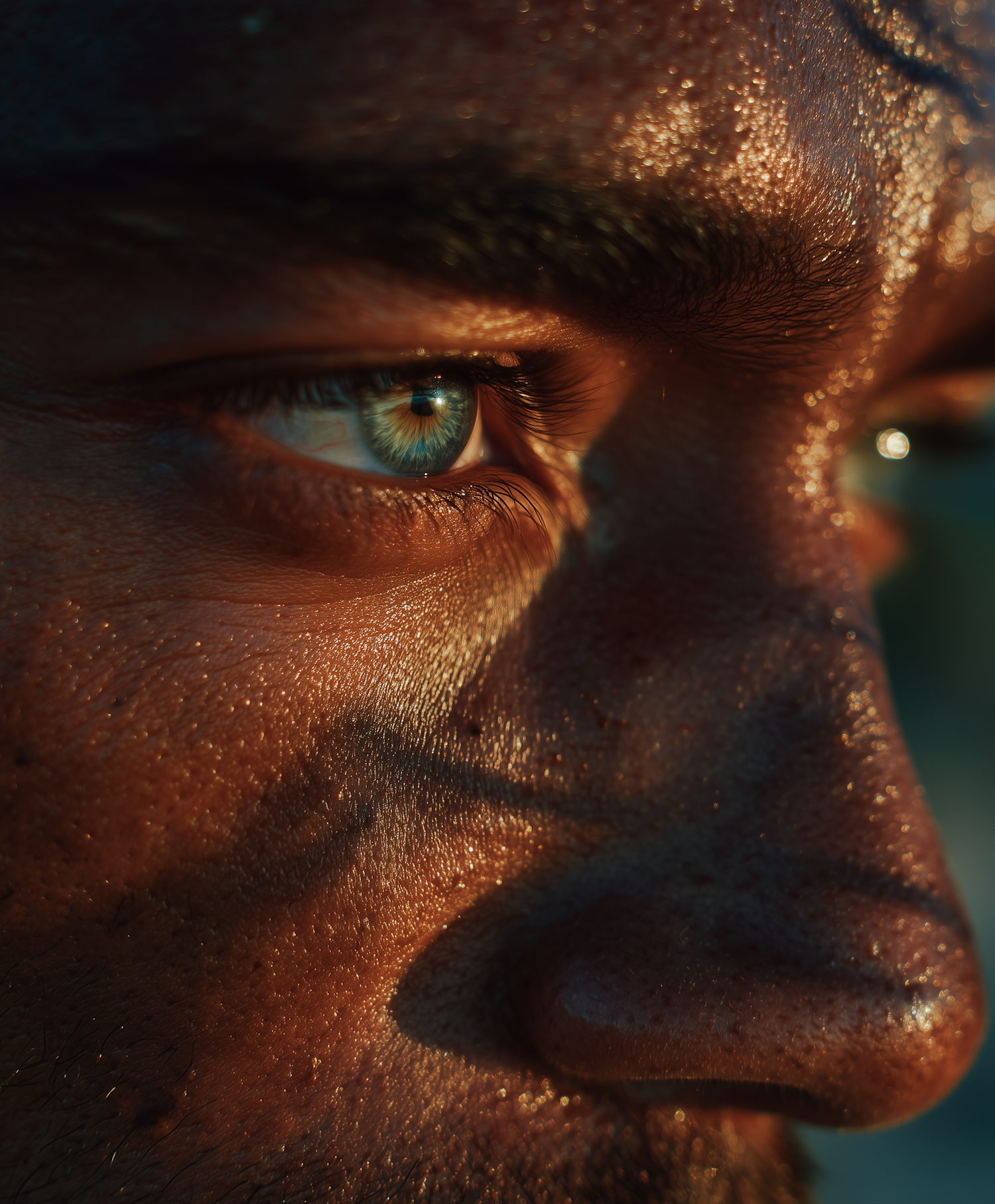 Close-up of a blue-green eye with detailed skin texture and sweat, illuminated by warm light for a dramatic and intense effect.