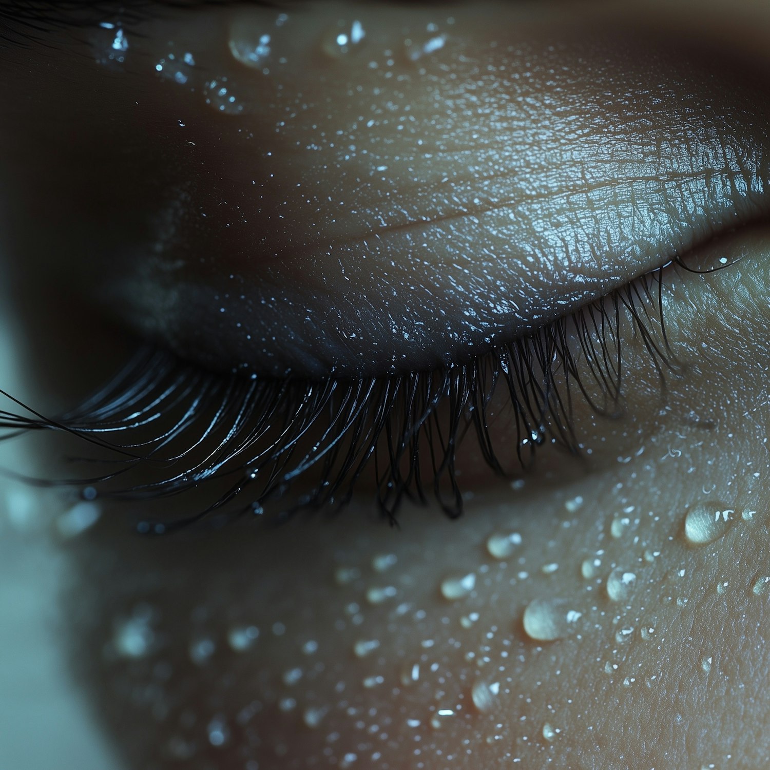 Close-up of a closed eye with water droplets on skin and lashes, highlighting fine textures and a serene, cool-toned lighting effect.