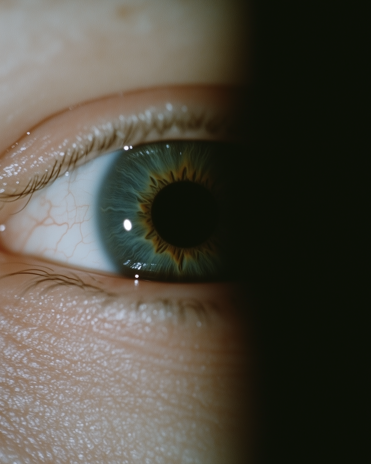 Close-up of a vibrant green and yellow iris with intricate details, framed by light-toned skin and delicate eyelashes, partially shadowed.