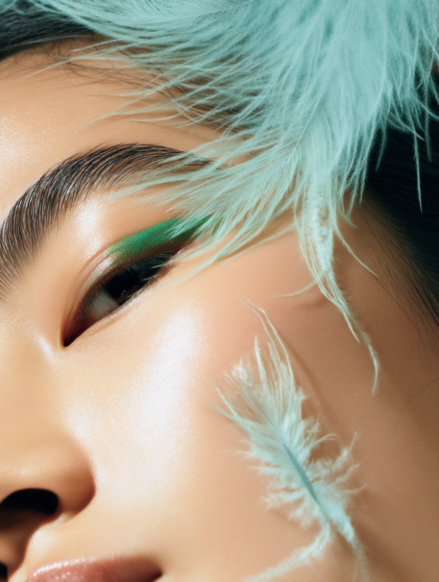 Close-up of a glowing face with bold green eyeshadow and a soft blue feather, creating a whimsical and ethereal vibe.