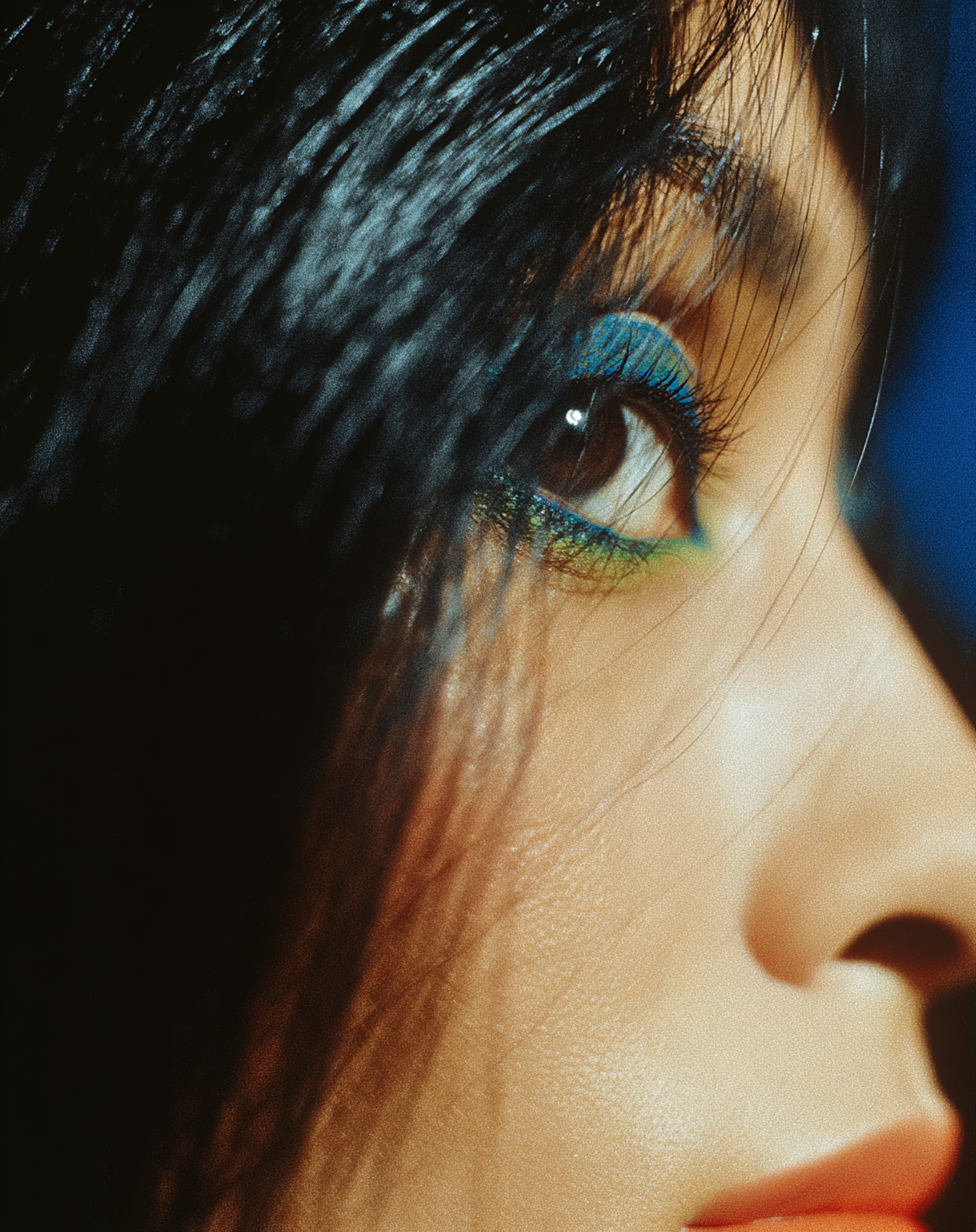 Close-up of a person’s eye adorned with vibrant makeup in blue and green tones, framed by black hair strands, artistic lighting.