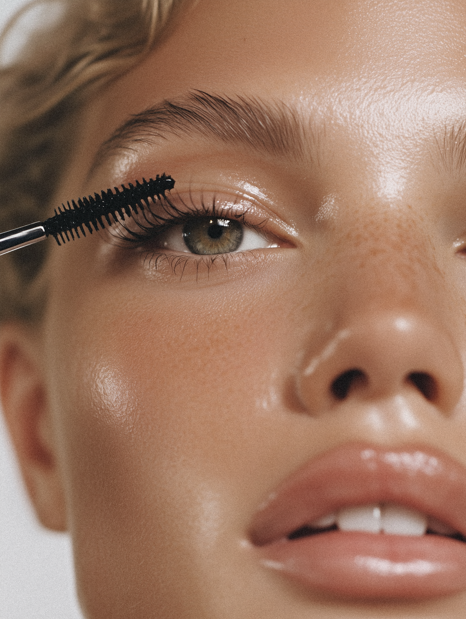 Close-up of a green eye with mascara application, showcasing natural freckles, glossy lips, and a radiant complexion.