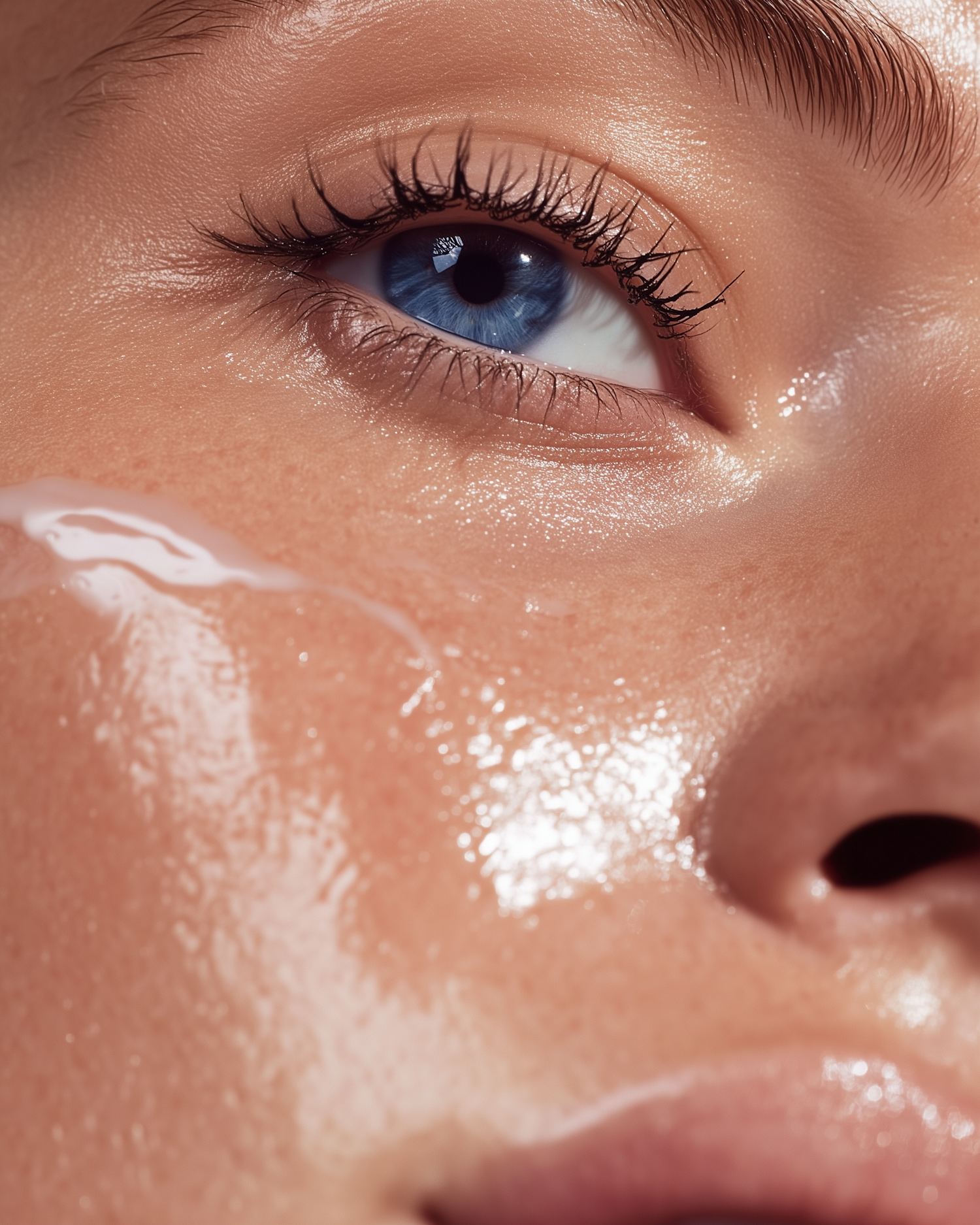 Close-up of a blue eye with dewy, freckled skin and glossy skincare product. Perfect for beauty and skincare inspiration.