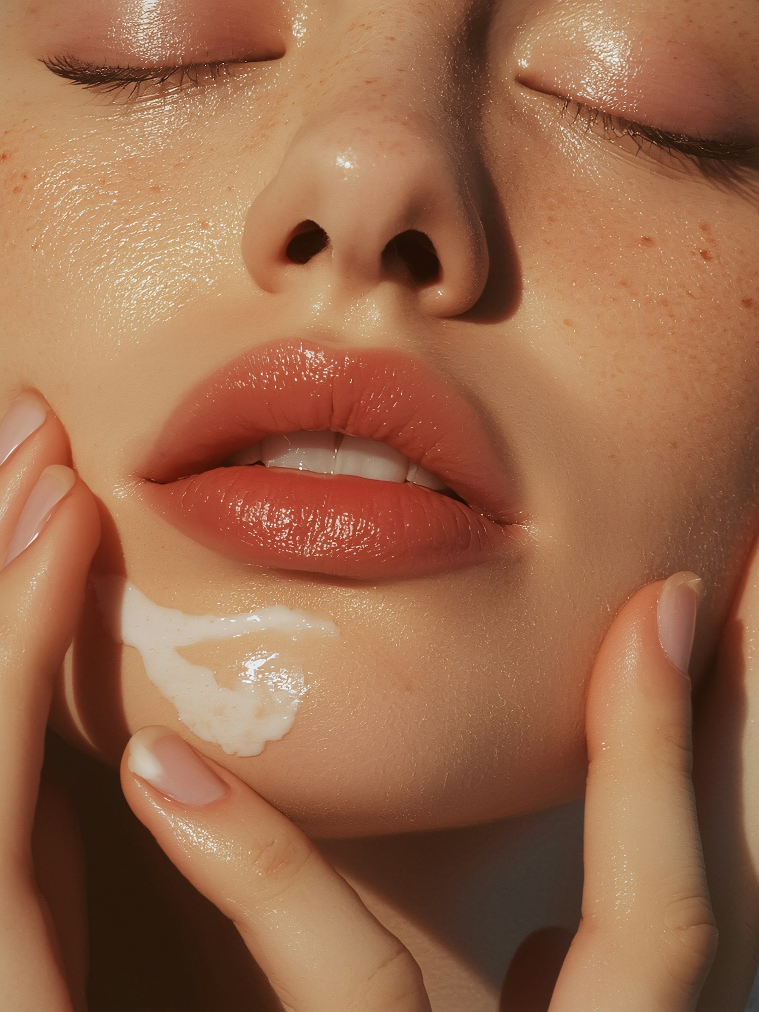 Close-up of a freckled face with glossy lips and cream on the chin, highlighting smooth skin and well-manicured nails.