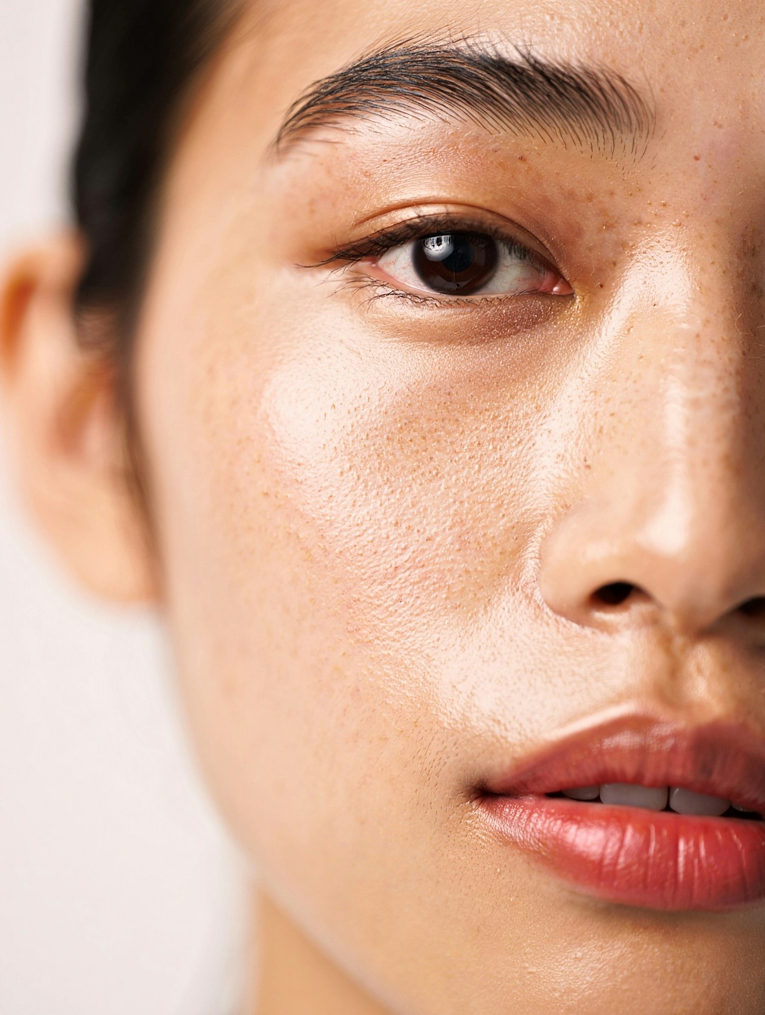 Close-up of a freckled face with glowing skin, almond-shaped eye, and natural pink lips. Perfect for skincare or beauty content.