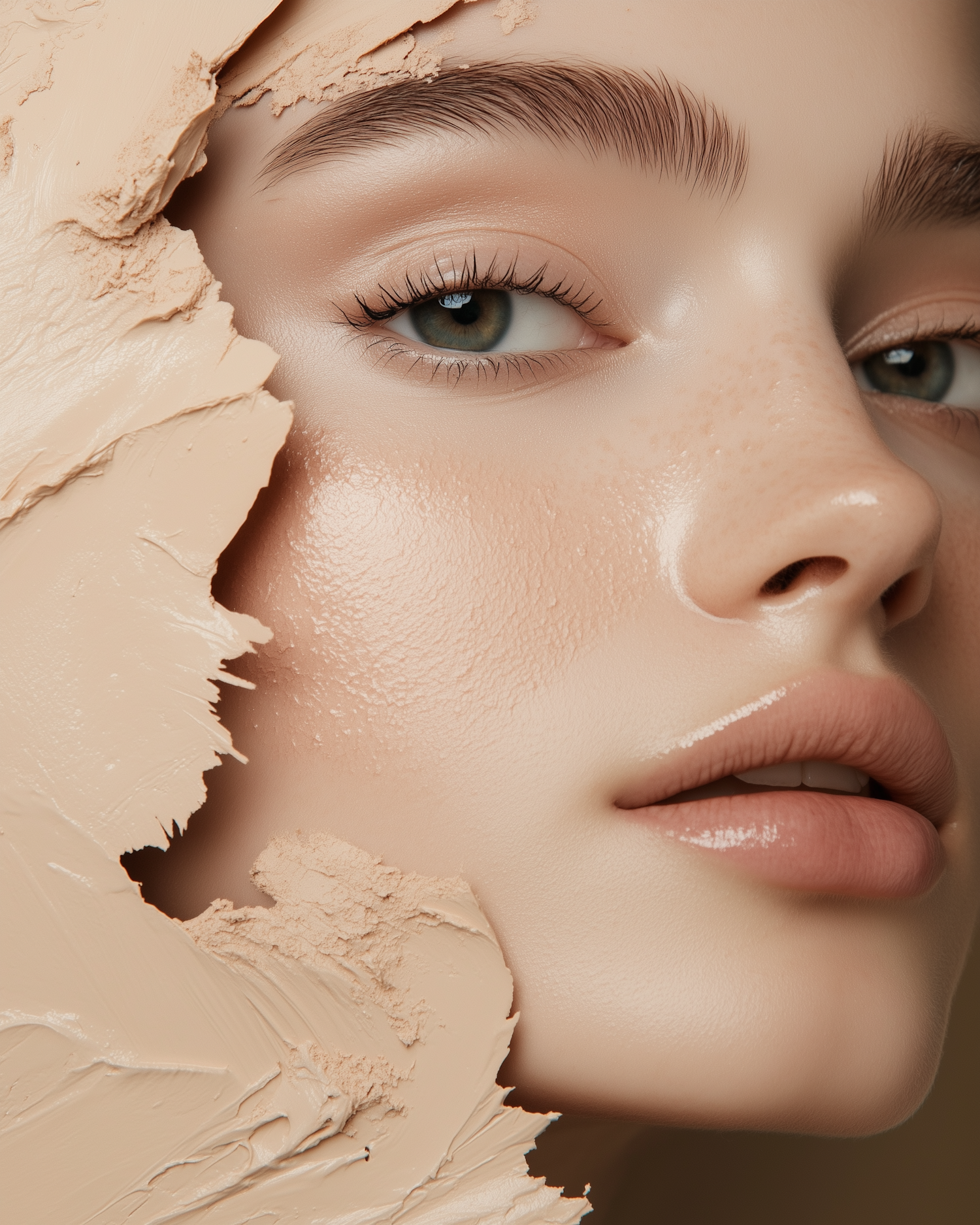 Close-up of a woman's face with artistic makeup application, highlighting green eyes and glossy lips. Beige tones create a sculpted effect.
