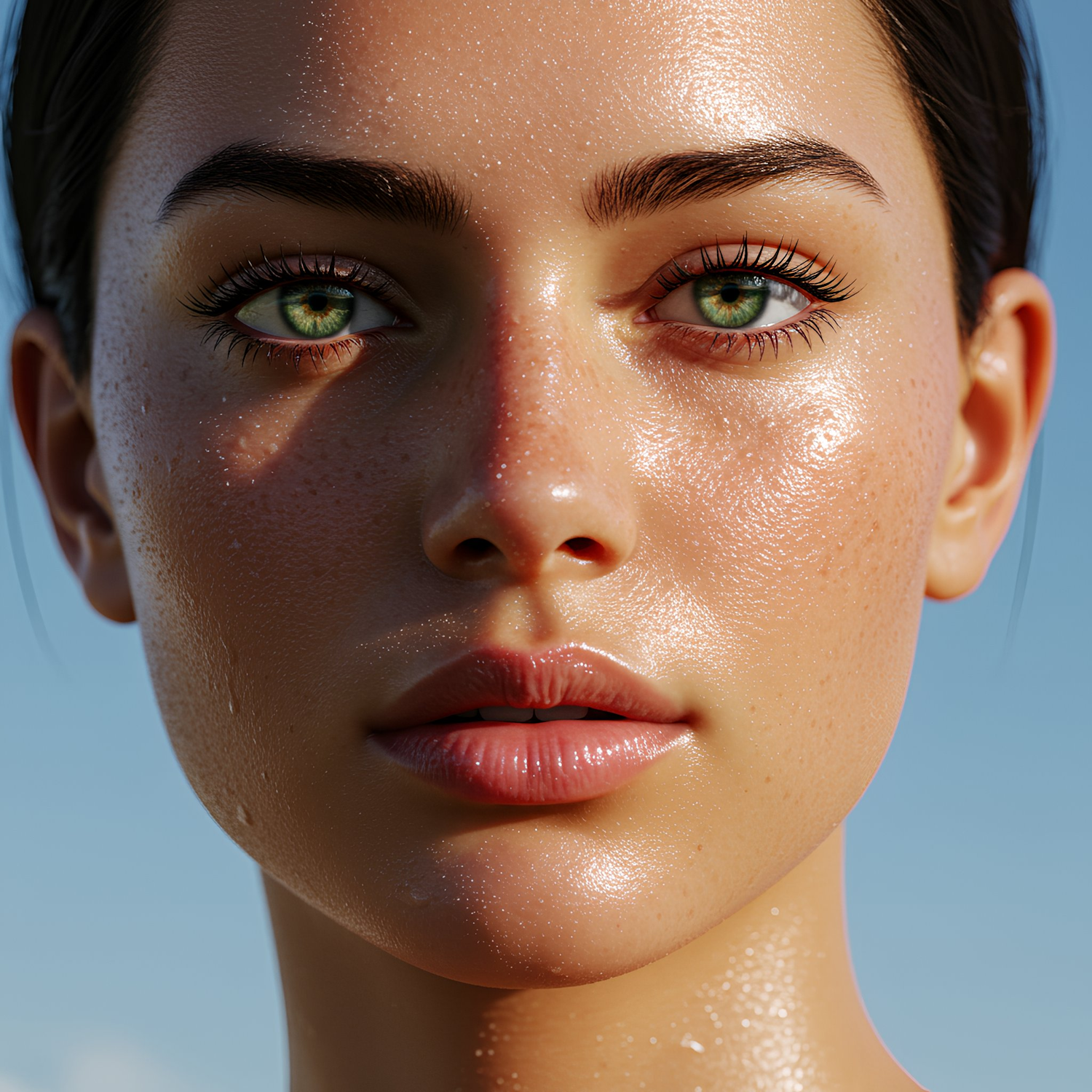 A highly detailed close-up of a face with stunning green eyes, highlighted by sunlight and a clear sky background.