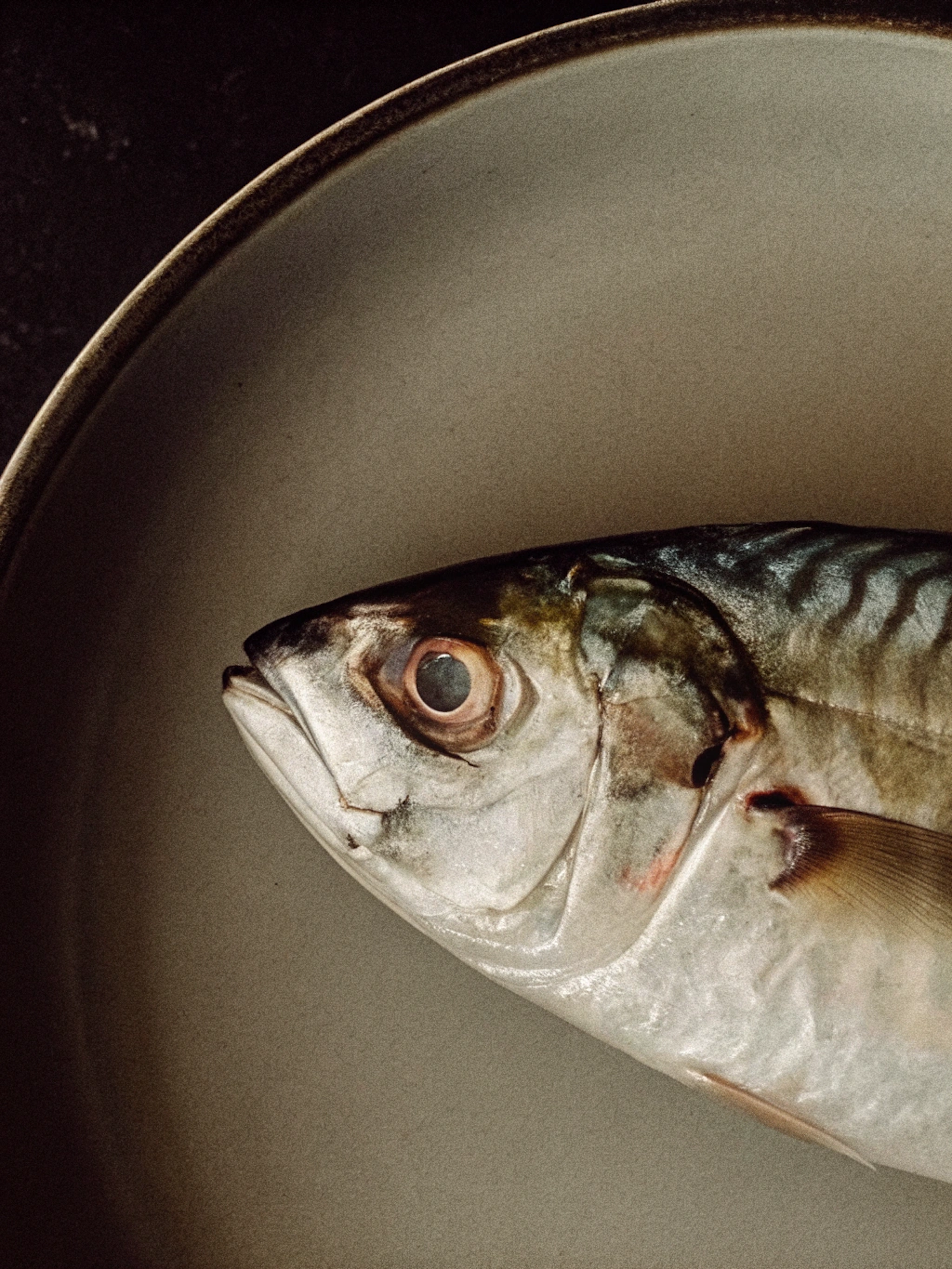 Close-up of a fresh fish on a ceramic plate with a dark background, showcasing its silvery scales and dramatic lighting.