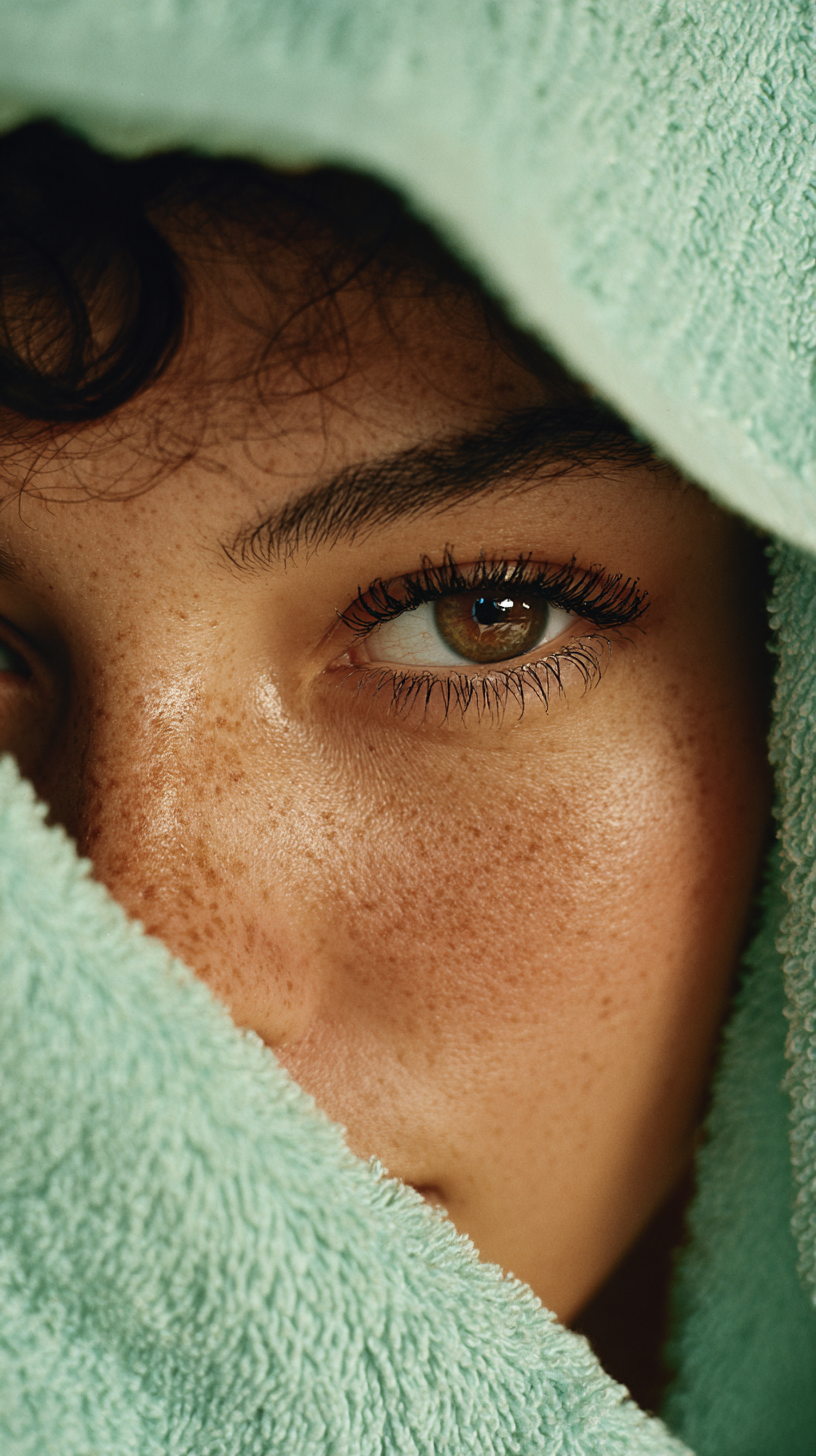Close-up of a freckled face with a green eye, partially covered by a soft green towel, showcasing natural beauty and texture.