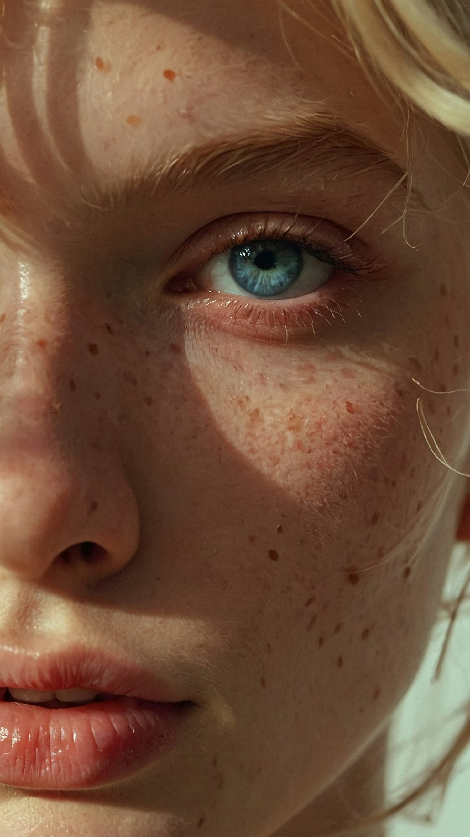 Close-up of a freckled face with striking blue eyes, natural pink lips, and blonde hair in soft natural lighting.