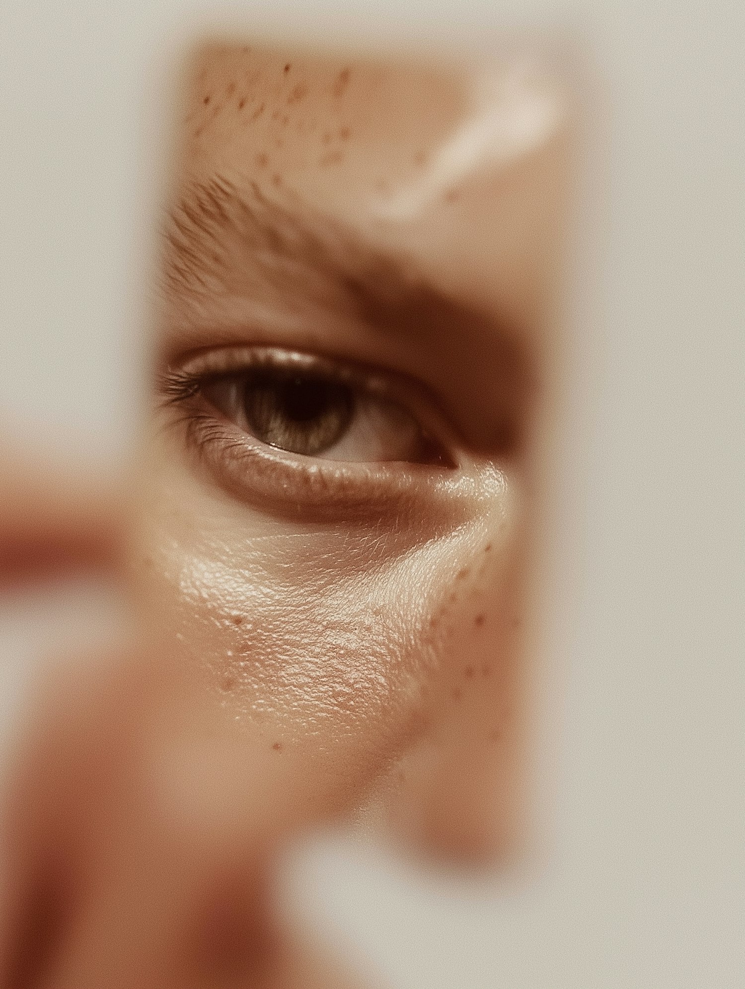 Close-up of a human eye with detailed skin texture and freckles, showcasing natural beauty and intricate details.