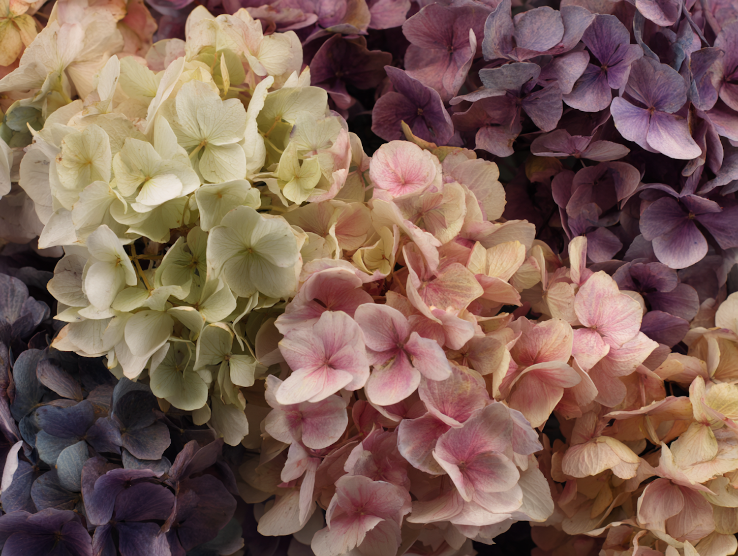 A beautiful close-up of hydrangeas in varying shades of pink, purple, and cream, showcasing their delicate petals in sharp detail.