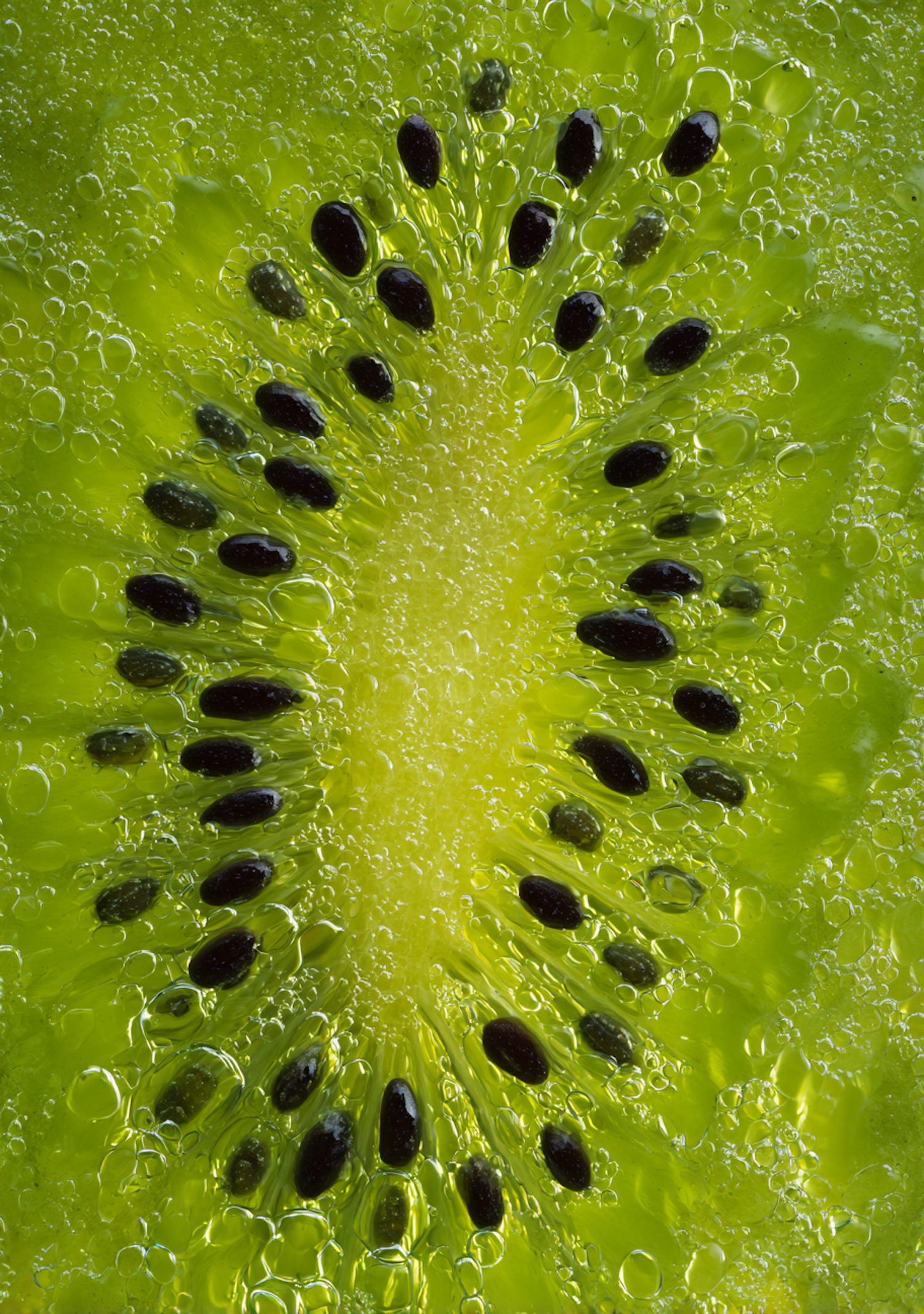 Close-up of a vibrant green kiwi slice with black seeds and air bubbles, showcasing its fresh and juicy texture in stunning detail.