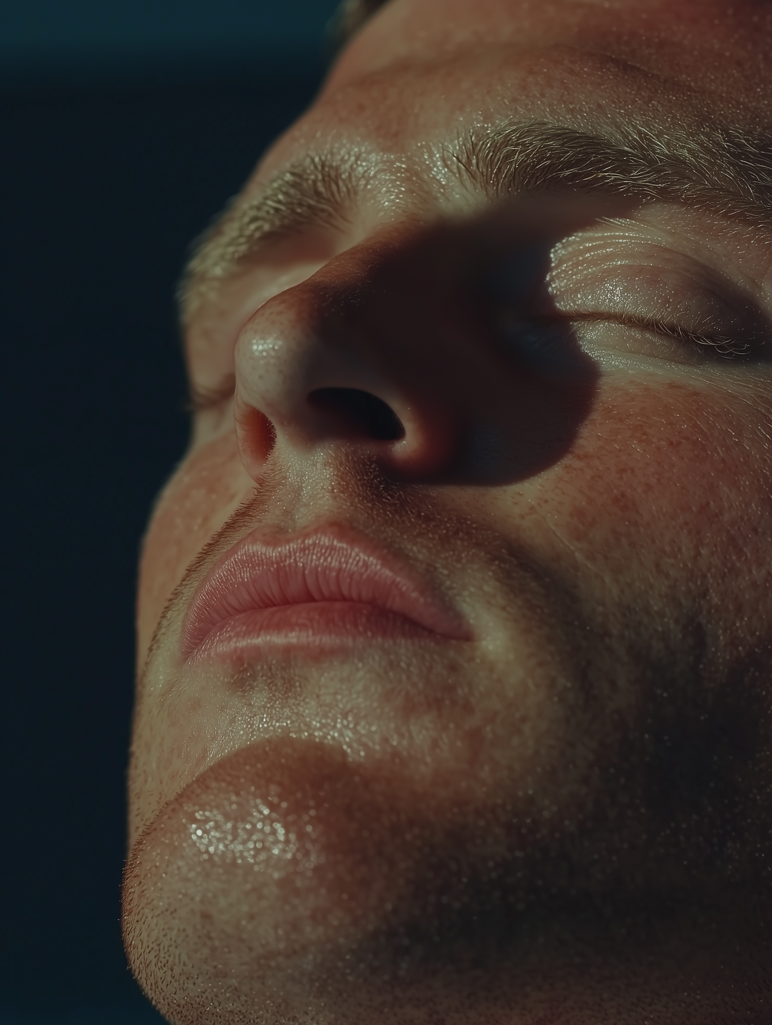 Close-up of a man's face with freckles, stubble, and closed eyes, highlighted by dramatic lighting and a dark background.