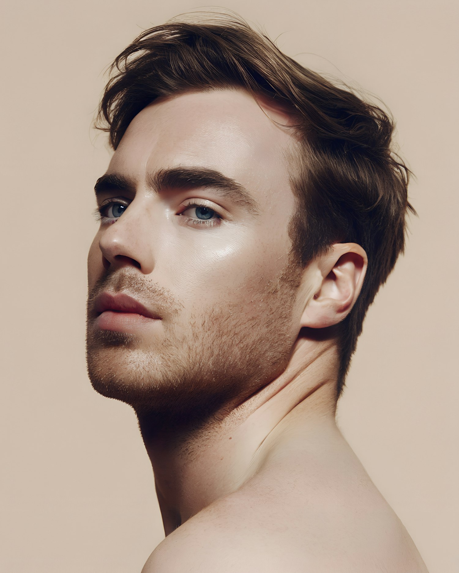 Close-up of a young man with blue eyes, light stubble, and tousled brown hair against a beige background. Minimalist and striking.