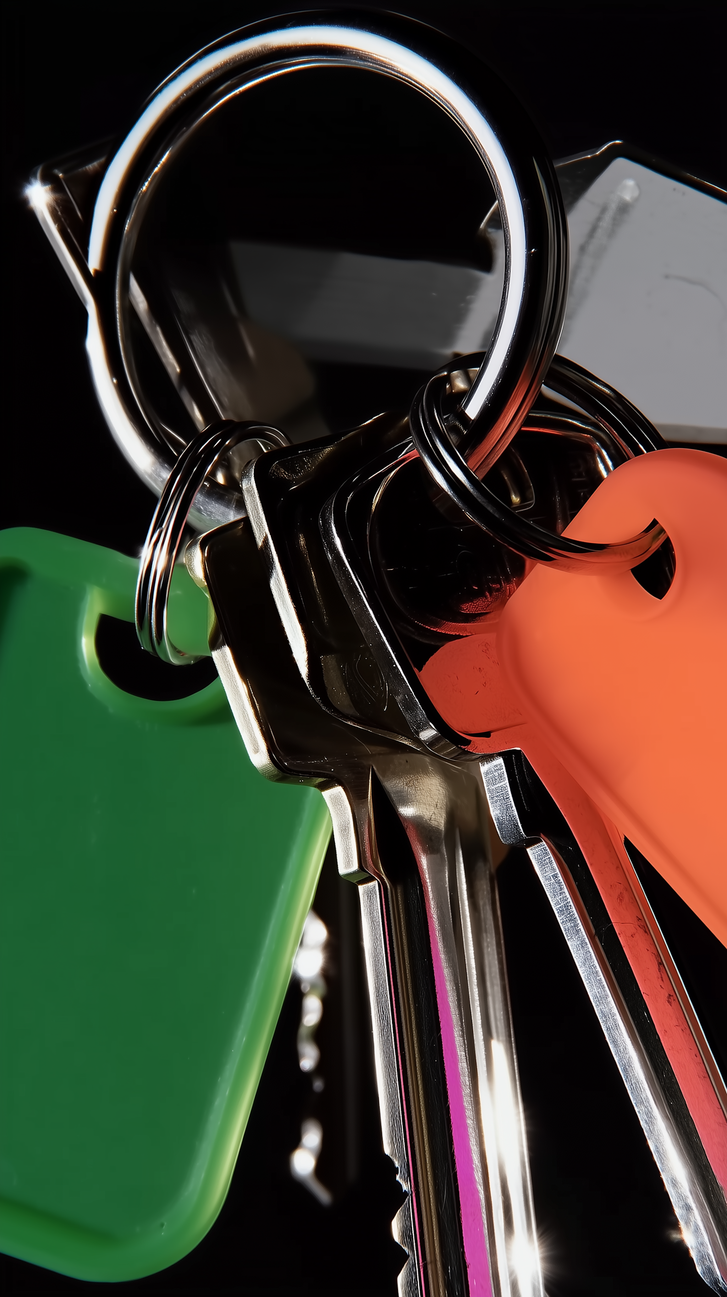 Close-up of shiny metallic keys with vibrant green and orange key tags on a silver keyring, set against a dark background.
