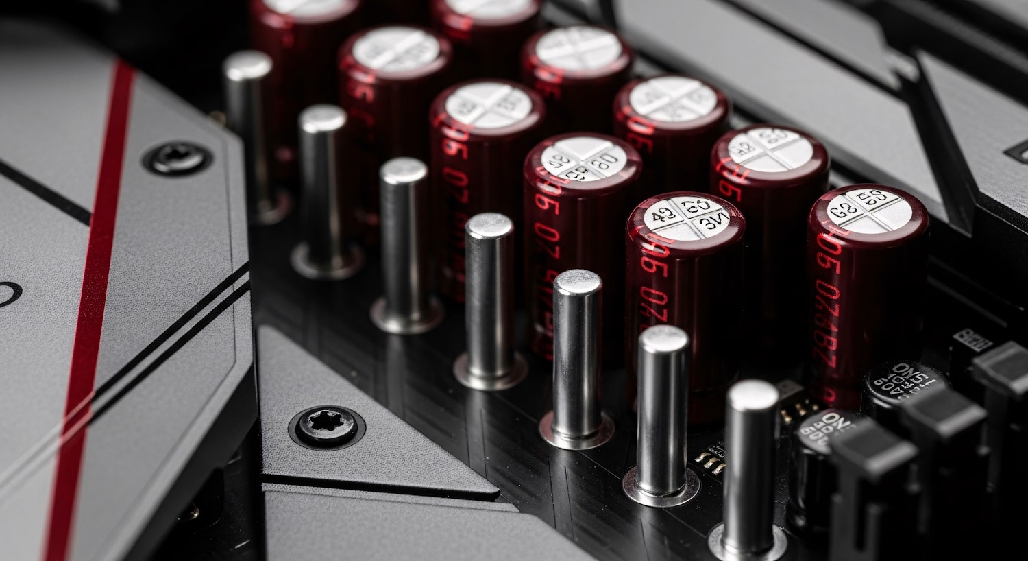 Close-up of a computer motherboard showcasing red capacitors and metallic components on a sleek, modern design.