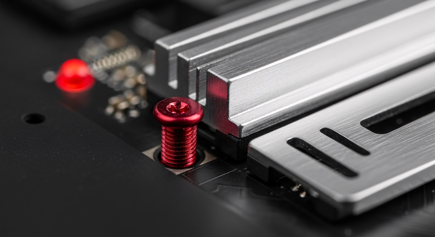 Close-up of a motherboard with a red screw, metallic heatsink, and glowing red LED, showcasing intricate computer hardware details.