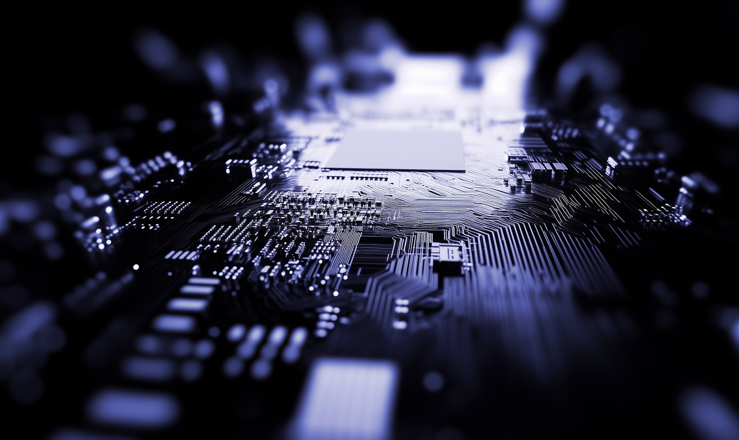 Close-up of a computer motherboard with glowing blue circuits and a central chip, creating a futuristic and high-tech vibe.