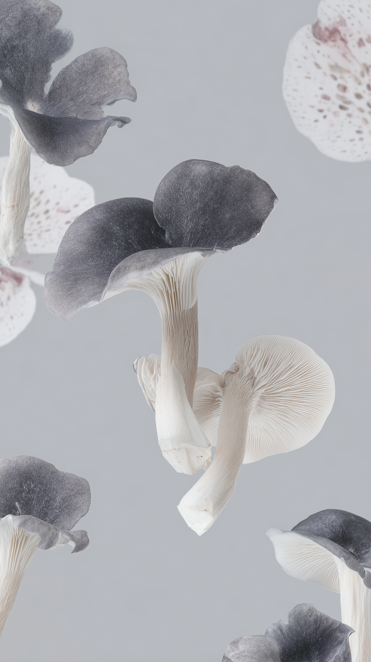 Artistic close-up of gray-capped mushrooms with visible gills on a neutral background, showcasing natural details and minimalist composition.
