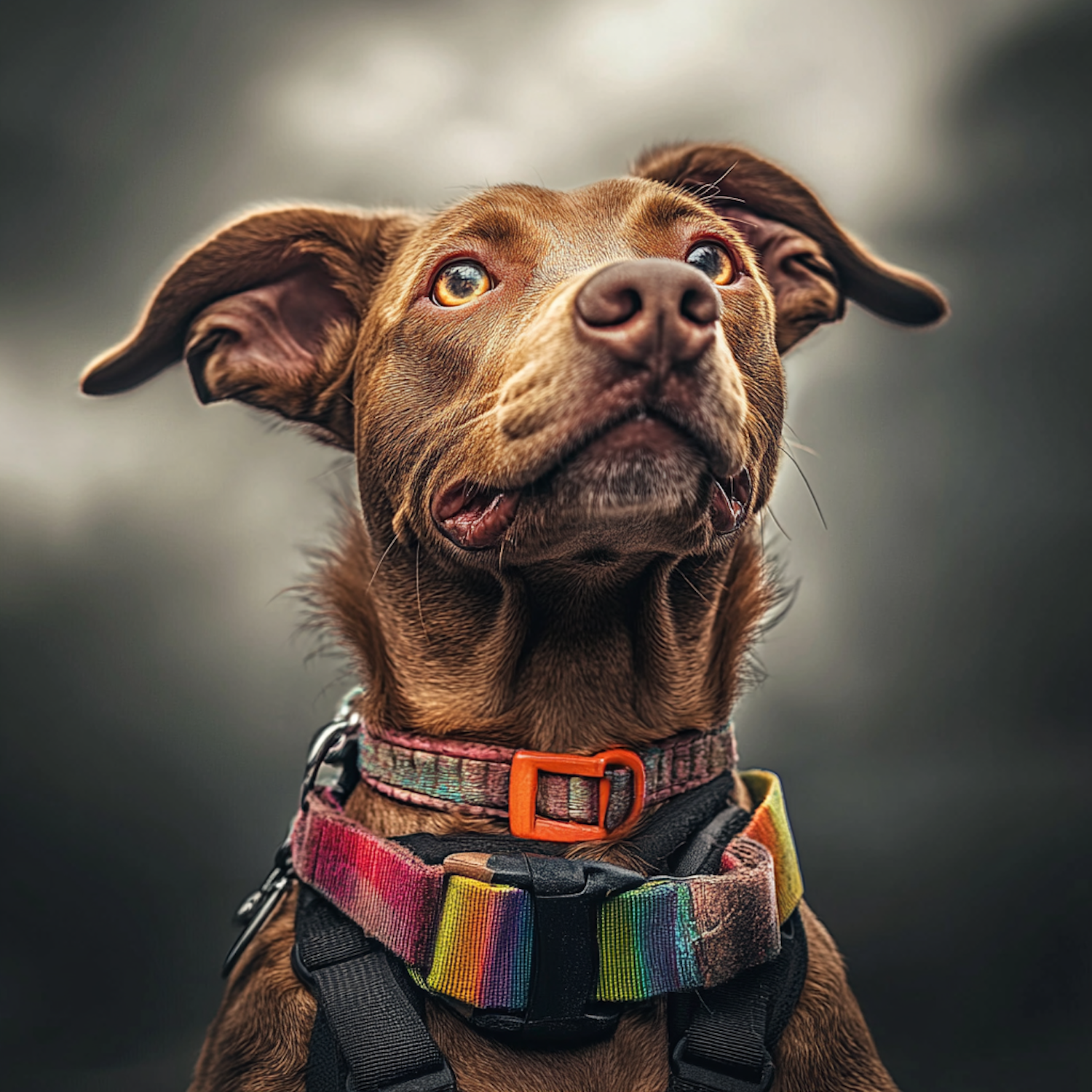 Brown dog with expressive eyes and colorful harness gazes upward against a moody sky, showcasing its curious and lively demeanor.