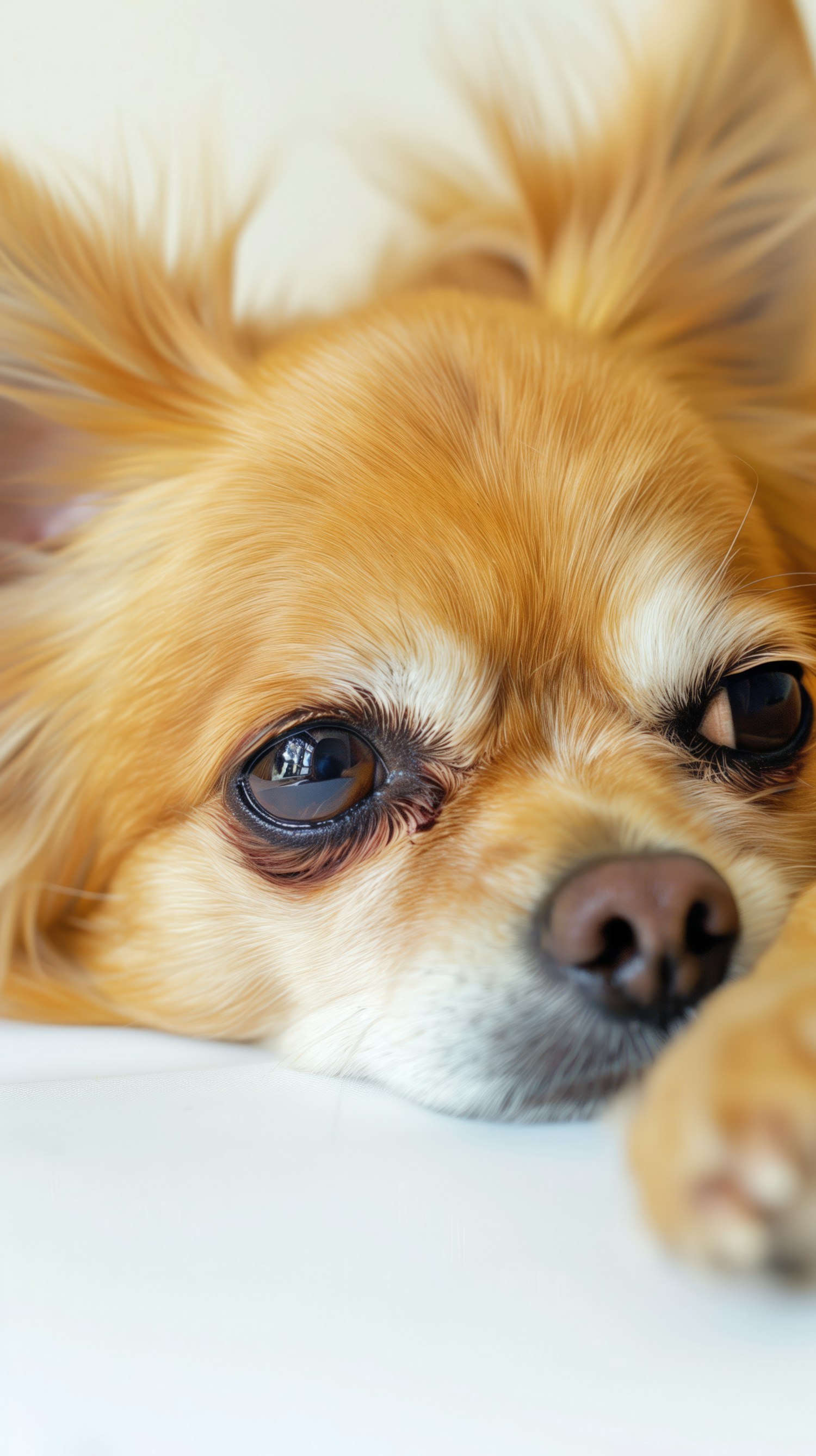 Close-up of a Chihuahua with expressive eyes and fluffy golden fur, lying down with a soft, neutral background.