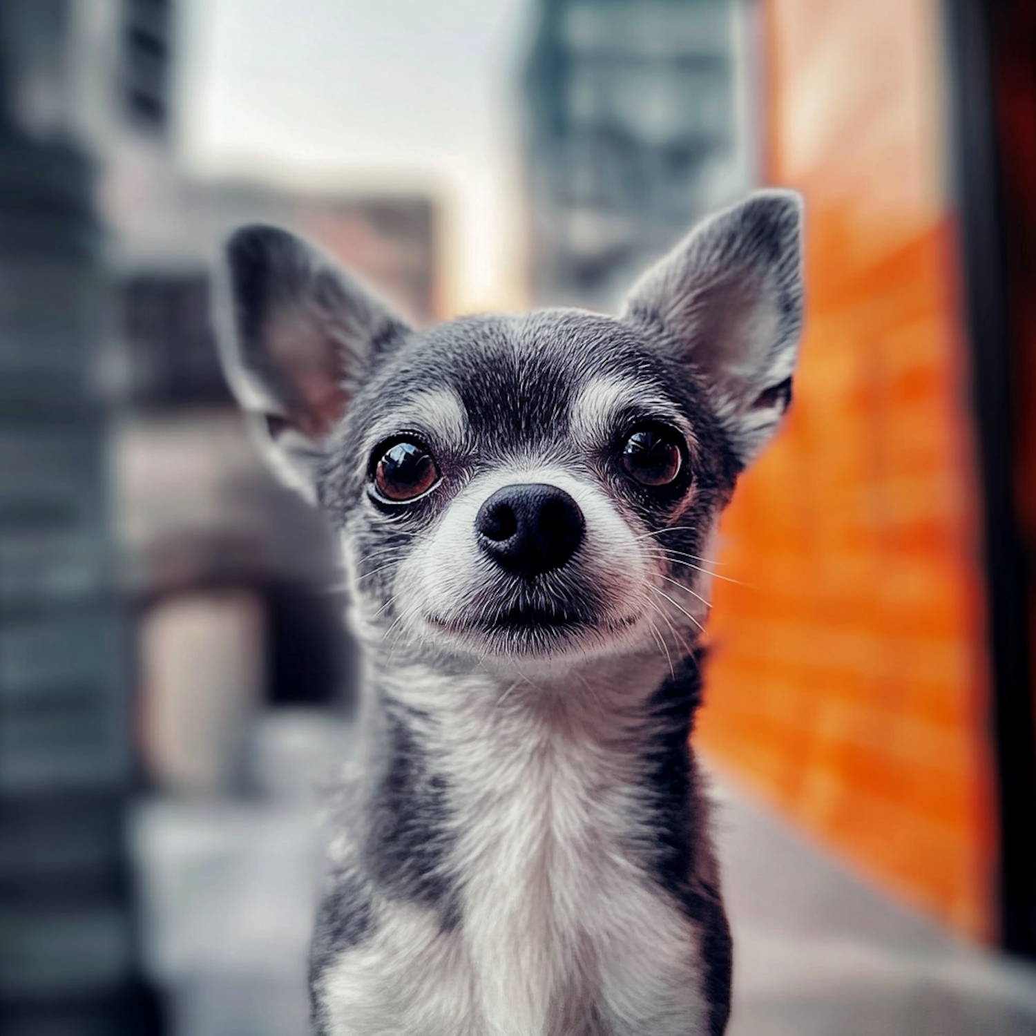 Adorable Chihuahua with gray and white fur, large brown eyes, and perked ears against a blurred urban background.