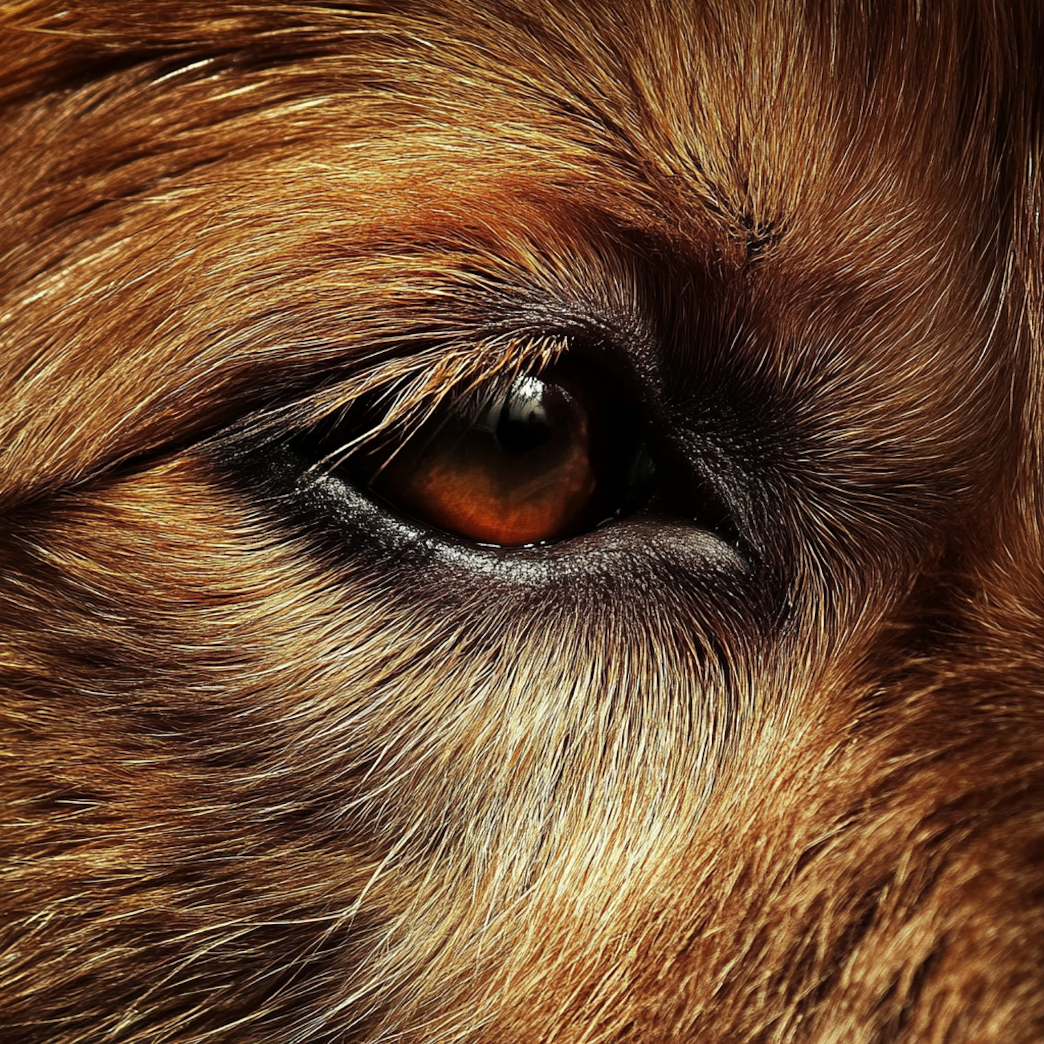 Close-up of a dog's eye with detailed fur texture and rich brown hues, capturing the natural beauty and depth of the animal's features.
