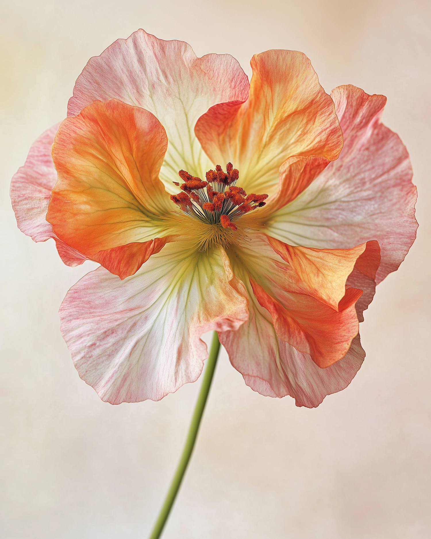 Close-up of a vibrant flower with pink, orange, and yellow petals and dark red stamens against a soft beige background.