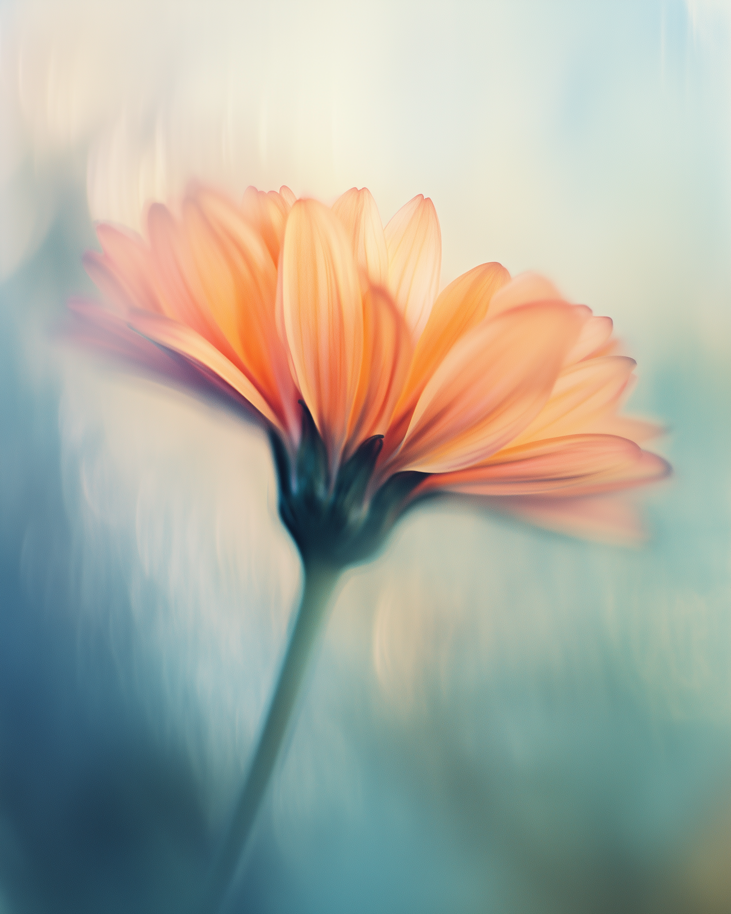 Close-up of an orange daisy with soft-focus petals against a dreamy blue and white background, creating a serene and ethereal vibe.