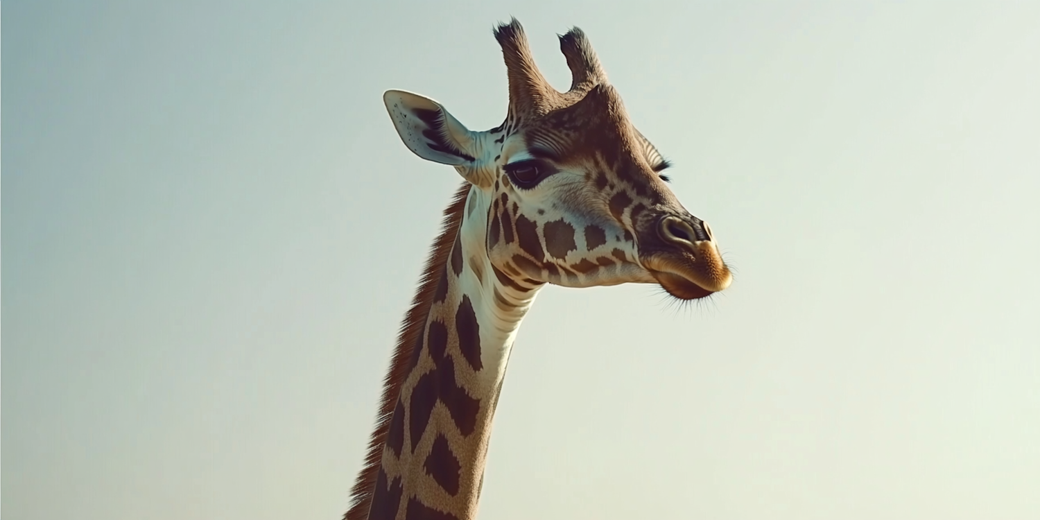 Close-up of a giraffe's head and neck against a clear sky, showcasing its unique patterns and gentle expression.