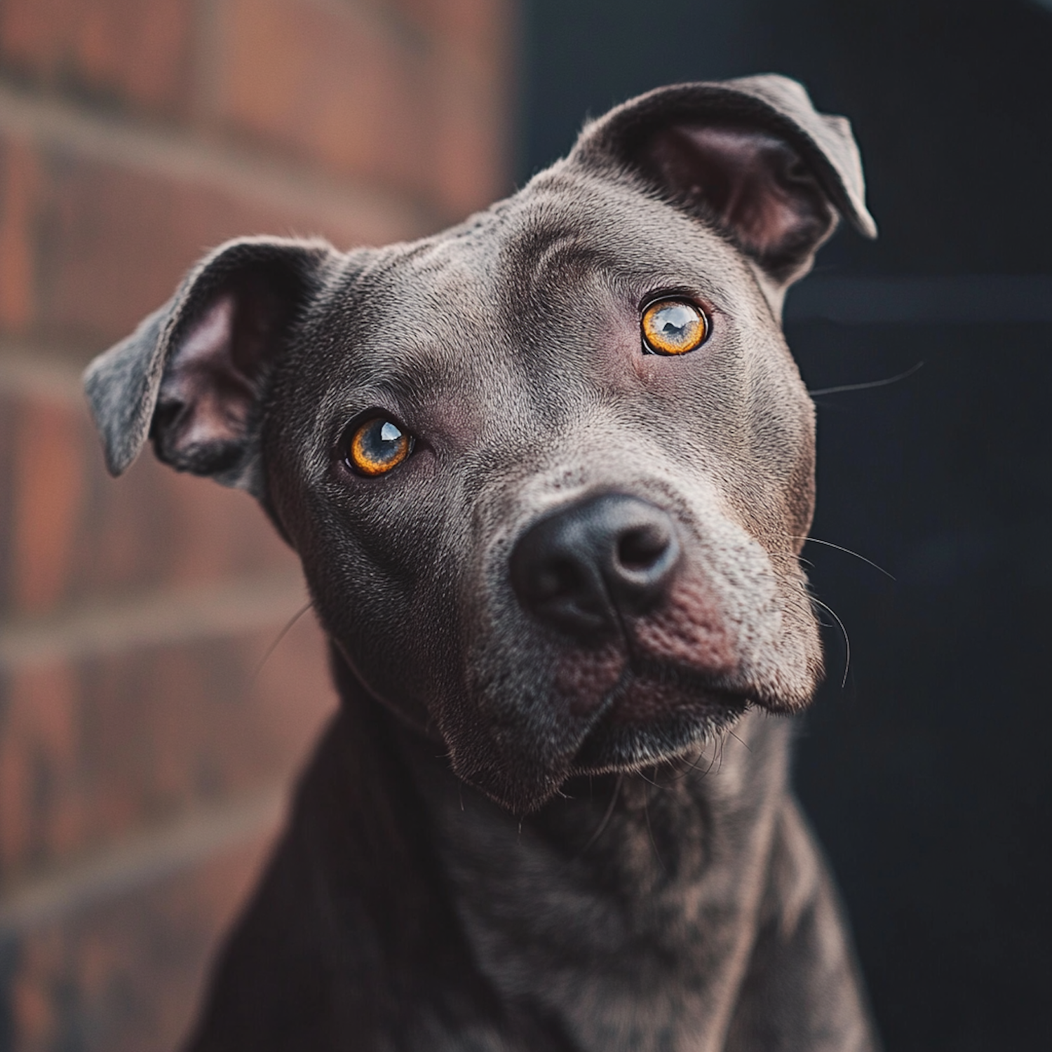 Close-up of a gray dog with amber eyes, tilting its head against a blurred brick wall background. Captivating and curious expression.