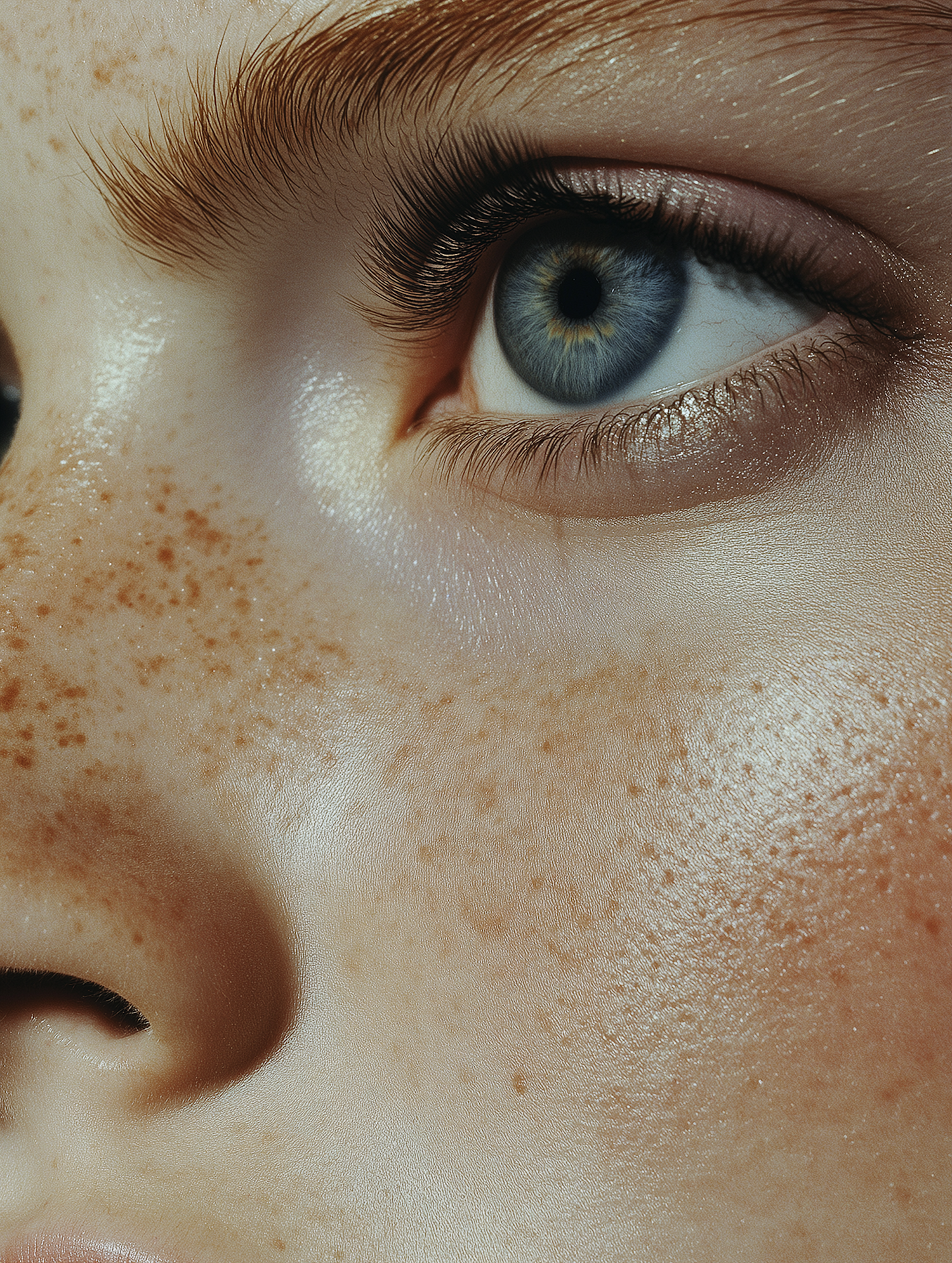 Close-up of a blue eye with detailed iris and freckled skin, highlighting natural beauty and texture.